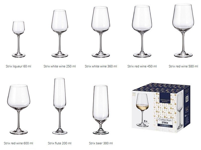 Скляні келихи серії Strix від чеського виробника Crystalite Bohemia дозволять оцінити найтонші відтінки смаку, кольору та прозорість напою. Вони відрізняються витягнутою чашею, що звужується вгору, яка допоможе відчути тонкий і летючий аромат ігристого вина і в якому насичене вино зуміє повністю розкритися. Спочатку букет розкриється в широкій чаші, а потім сконцентрується у верхній частині, що звужується.