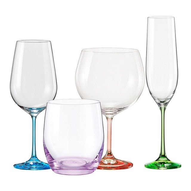- Виконання келихів з кольорового богемського скла. Кольорове скло виробляється складніше, ніж звичайне, техніка його виготовлення займає більше часу і потребує додаткових матеріалів, тому ціна вища.