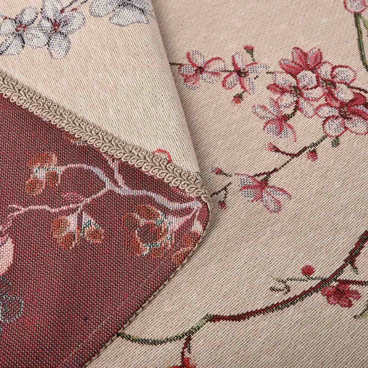 По светлому фону гобеленовой скатерти вьются ветви сакуры, длинные и очень нежные. Края изделия заключены в изящную рамку, окаймленную геометрическим орнаментом. Плотный гобелен соткан из прочных нитей хлопка и полиэстера. Цвета изделия, насыщенные и яркие, не тускнеют и не линяют даже после множественных стирок. Изделие не меняет размер и форму.