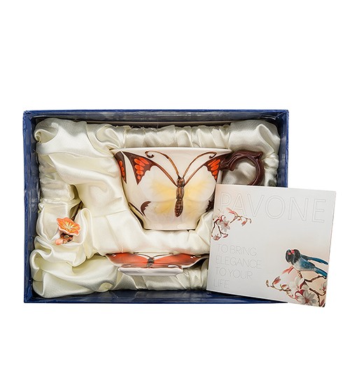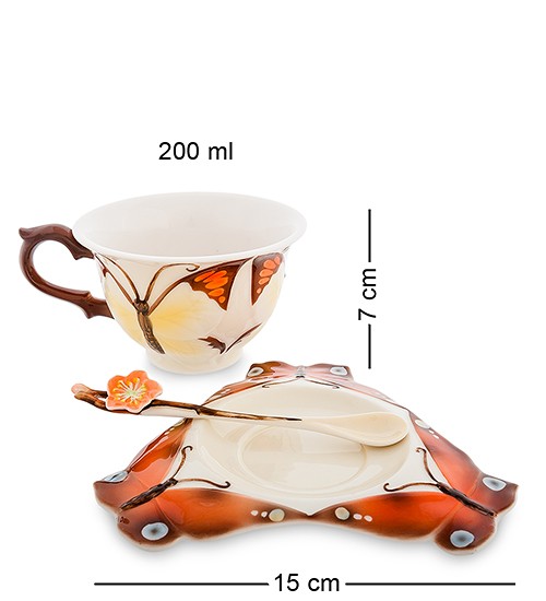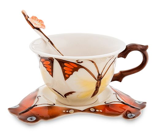 Изящная легкость тонкого фарфора сочетается с утонченностью воздушных крыльев бабочки. Держа такую чашку, чувствуешь её хрупкость и боишься повредить это произведение искусства. Из неё хочется пить только лучшие сорта чая, которые соответствуют этой композиции нежности и лёгкости. Три бабочки словно кружат над блюдцем, окружают его своими крыльями, будто охраняя напиток от посторонних.