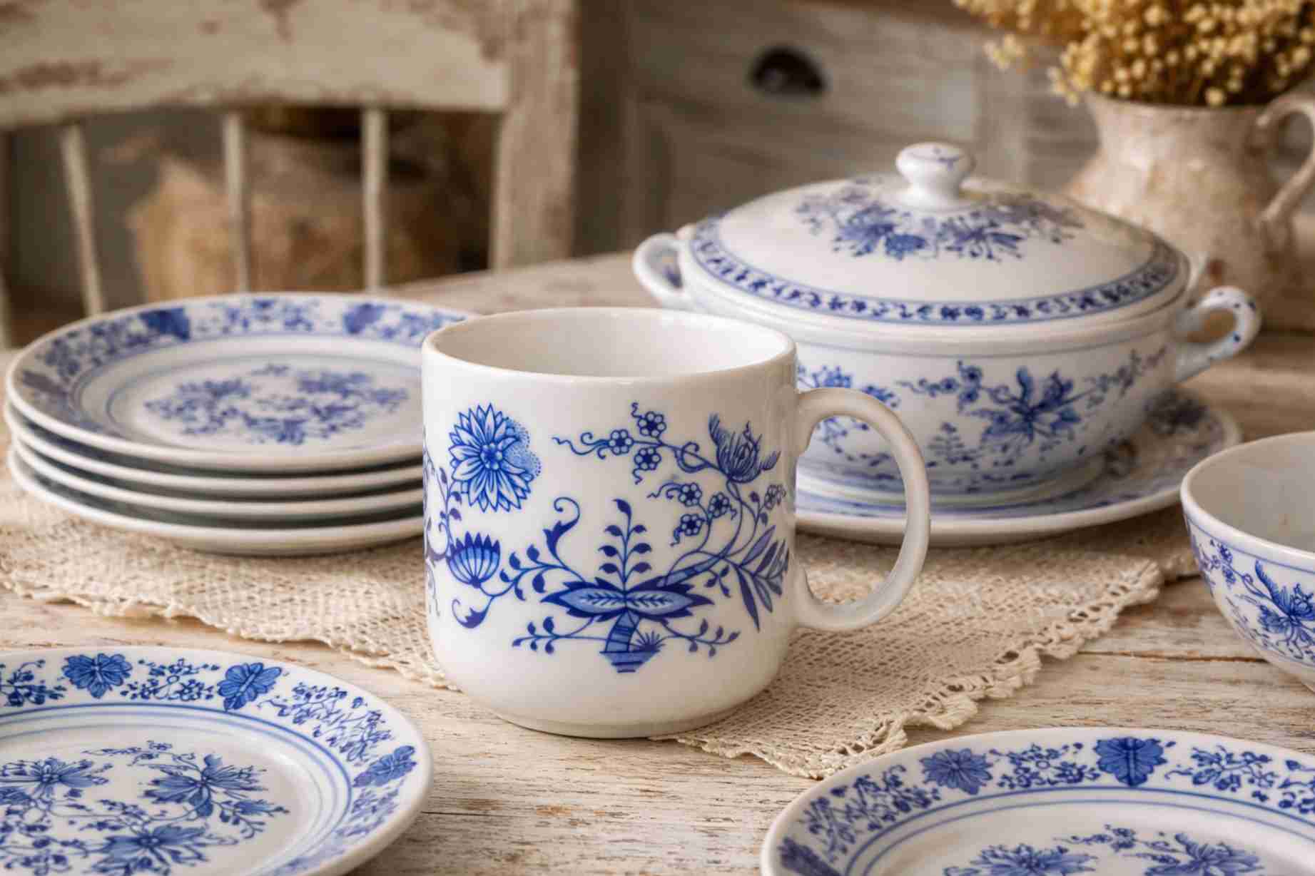 Порцелянові вироби серії "Цибульний малюнок" подарують вишукану вечерю в компанії запрошених родичів, колег, друзів, естетично сервірований стіл рідкісною ексклюзивною порцеляною дозволить створити особливу атмосферу затишку та достатку. Класичний білий порцеляни з малюнком у вигляді синіх кольорів і листя. Такий сервіз стане чудовим подарунком для близької людини.