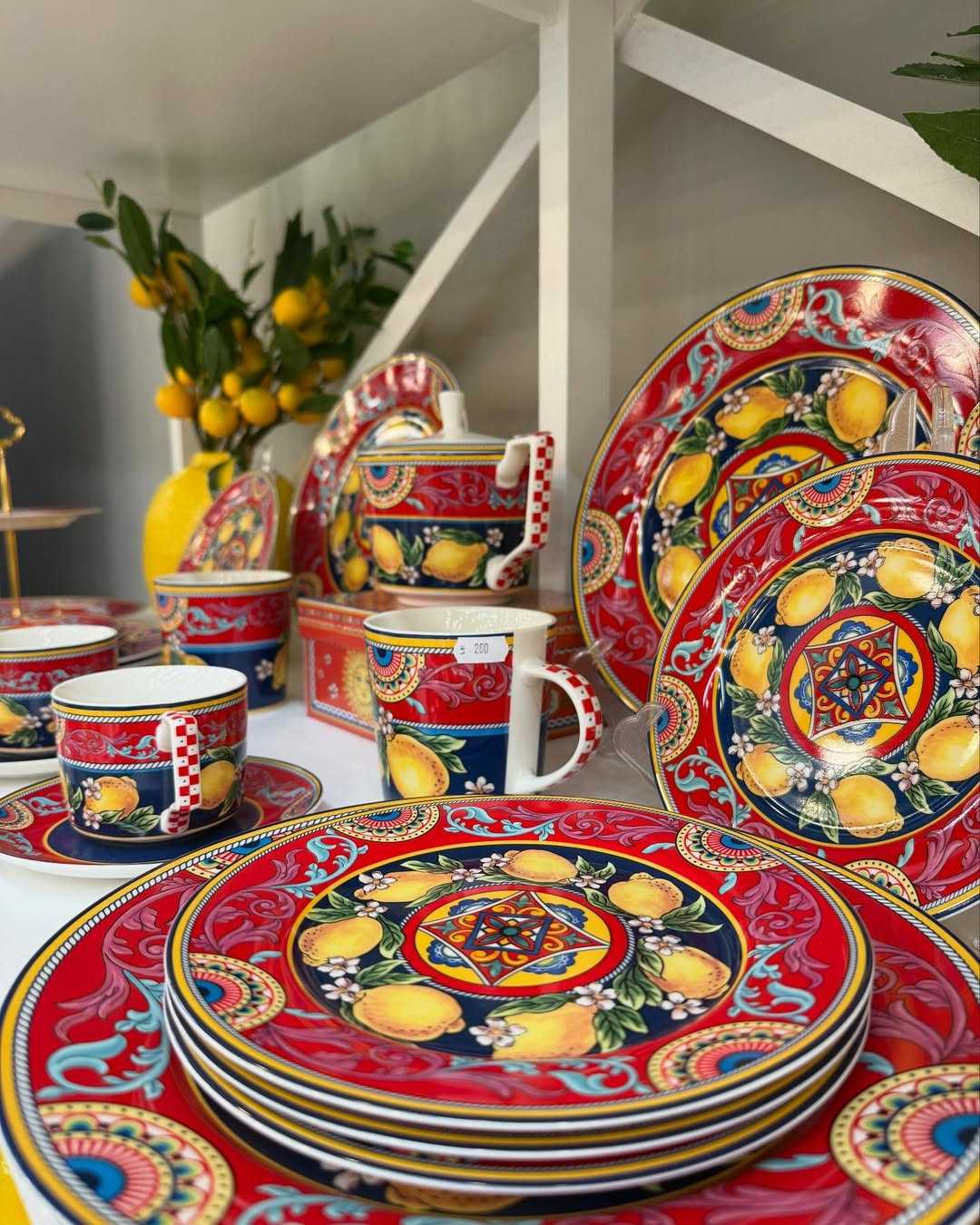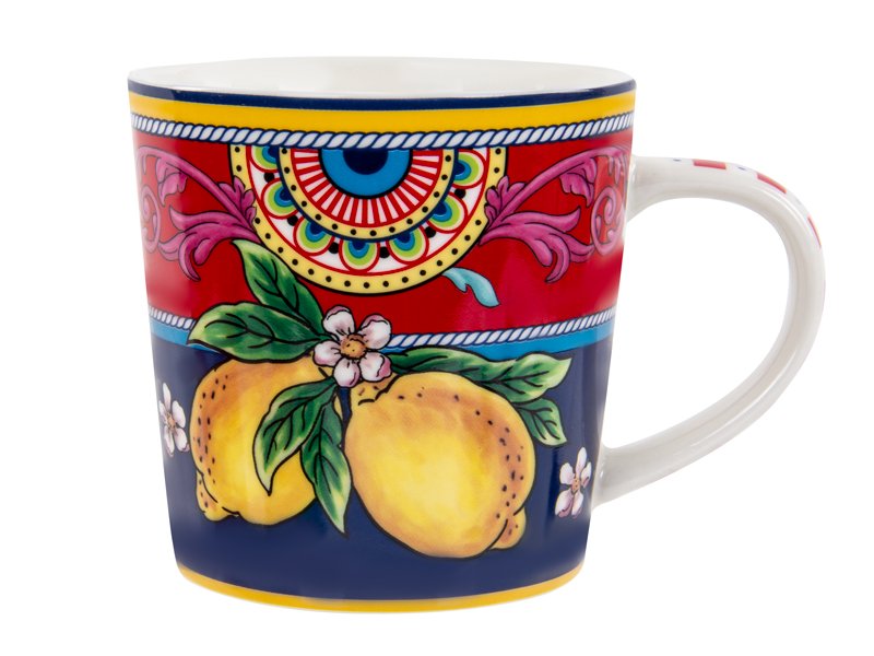 Чашка Dolche 400 мл – це справжній вибух кольорів на вашій кухні! Її яскравий візерунок у поєднанні червоного, синього та жовтого ніби оживлює простір, даруючи святковий настрій. Соковиті лимони, ніжні квіти та орнаменти у стилі сицілійських фресок перетворюють кожну чайну або кавову паузу на маленьку подорож сонячною Італією.