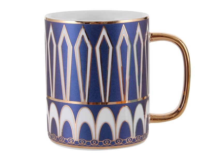 Колекція чашок Royal Glow — це витончене поєднання сучасного дизайну та шляхетної класики. Кожна чашка прикрашена вишуканим геометричним орнаментом із золотим акцентом, який сяє на світлі й надає виробу відчуття розкоші. Глибокі відтінки синього та ніжного рожевого підкреслюють гармонію та роблять кожну деталь унікальною.