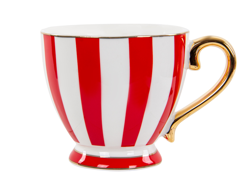 Ця фарфорова чашка на 450 мл – справжній акцент на вашому столі! Яскраві червоно-білі смуги створюють атмосферу свята та радості, а витончена золота ручка додає виробу нотку розкоші. Кожна деталь виконана з увагою до якості: гладка поверхня фарфору приємно виблискує, а акуратна кайма підкреслює елегантність форми.