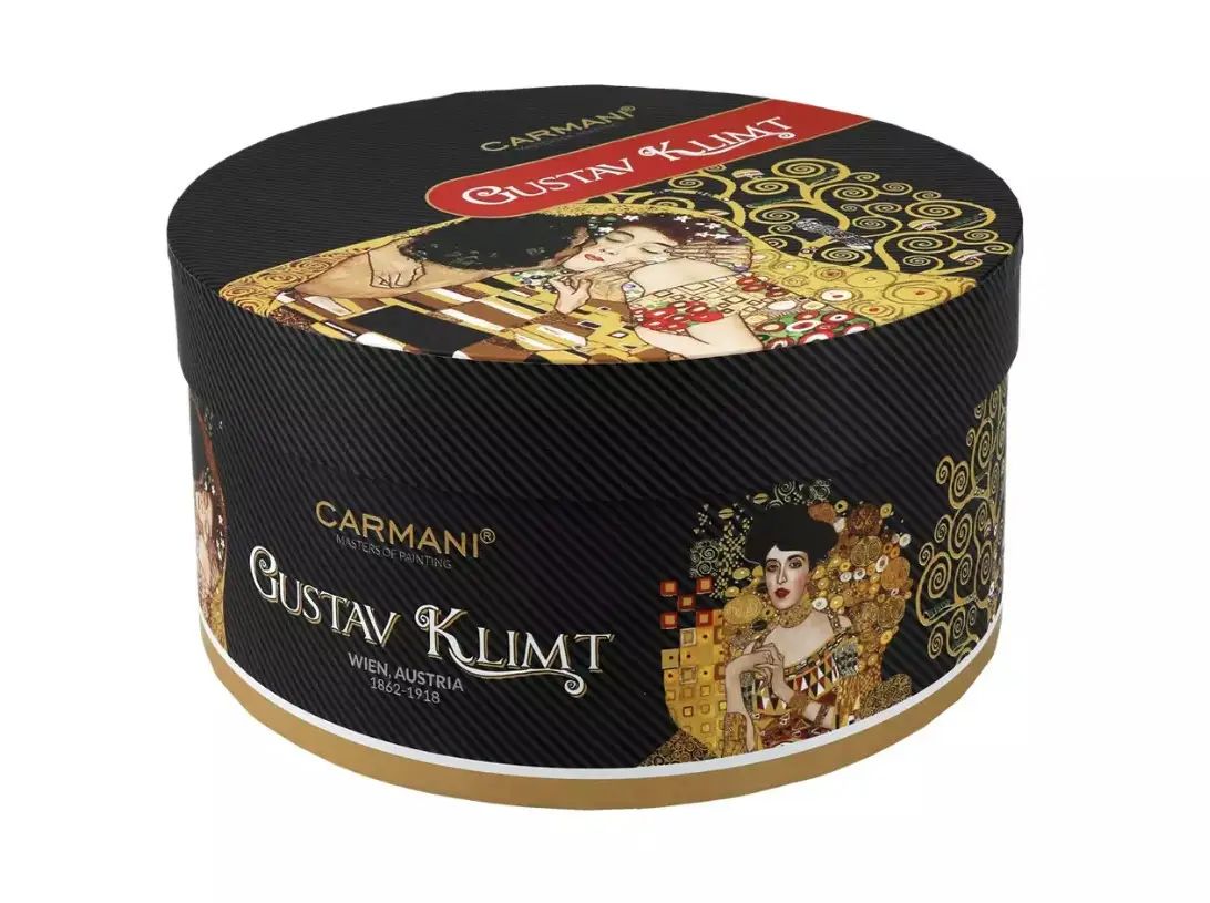 На фото зображено вишуканий набір Carmani — чашка з блюдцем, виконані за мотивами відомого портрета «Адель» Густава Клімта. Глибокий чорний фон, насичені золоті візерунки та виразний жіночий образ створюють відчуття справжнього витвору мистецтва, перенесеного на порцеляну. Малюнок виглядає об’ємним і деталізованим, а глянцева поверхня підкреслює багатство кольорів і робить композицію особливо ефектною при різному освітленні.