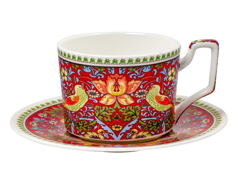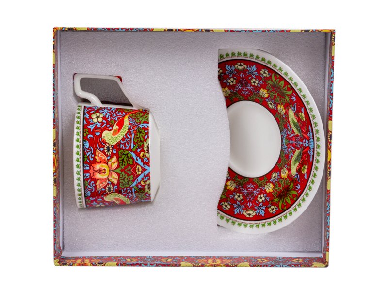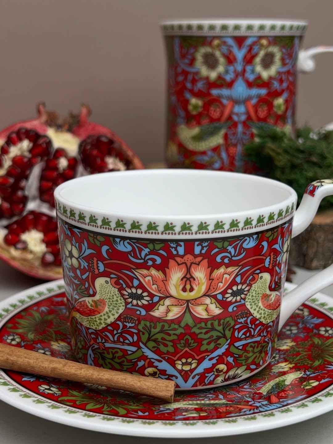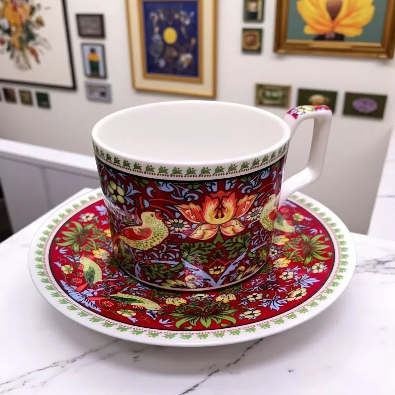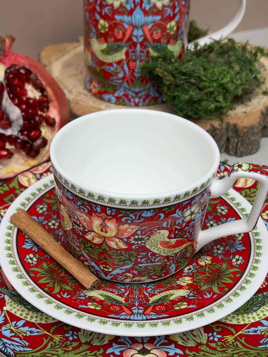Чайний набір «Морріс» — це яскраве поєднання англійського стилю та східного колориту, втілене у витонченій формі. Кожна деталь продумана до дрібниць: від плавних ліній чашки до насиченого орнаменту, натхненного природою. Червоне тло з квітами та птахами привертає погляд, наповнюючи атмосферу теплом і енергією, а білосніжний фарфор додає легкості та вишуканості.