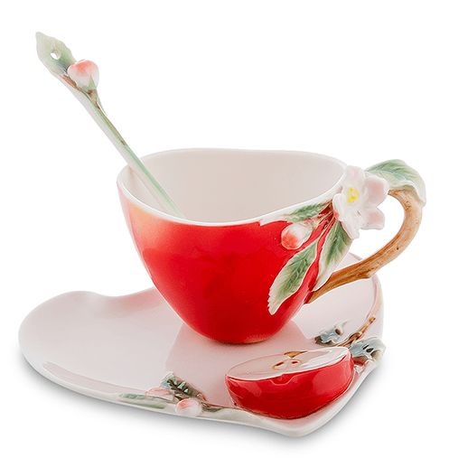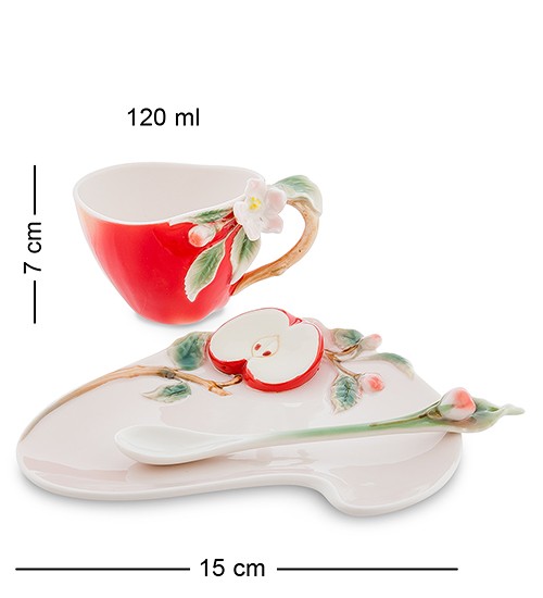 Соковита, яскрава, весела, що віддає ароматом саду, ця чайна пара зігріє та порадує своєю красою. Вдале поєднання форм і кольорів, оригінальна скибочка осіннього яблука, що примостилася на блюдце, — все це робить чайну пару «Яблуко» неповторною, красивою, цікавою. Такі яскраві речі насичують атмосферу будинку радістю, спокоєм і затишком, а як подарунок близькій людині просто прекрасні, висловлюючи вашу турботу і неординарний підхід до вибору презенту.