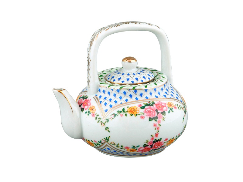 Цей заварювальний чайник об’ємом 270 мл виготовлений із міцної порцеляни та прикрашений яскравим квітковим орнаментом із золотими акцентами. Його вишуканий дизайн гармонійно поєднує білосніжну поверхню з насиченими візерунками у синіх і рожевих відтінках, створюючи атмосферу затишку та краси на вашому столі.