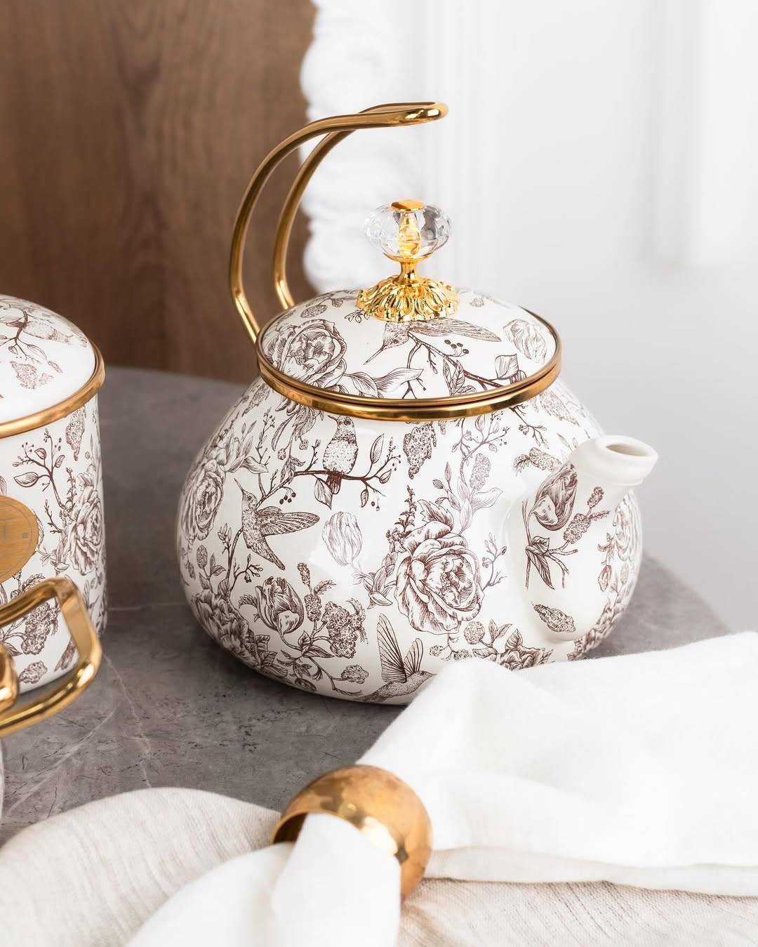 Колекція посуду "Птаха" поєднує в собі вишуканий дизайн, функціональність і декоративну цінність. Кожен виріб виконаний у кремово-білому кольорі з тонким квітковим візерунком і акуратною позолотою. Прозорі ручки на кришках і округлі форми підкреслюють стиль вінтажної класики.