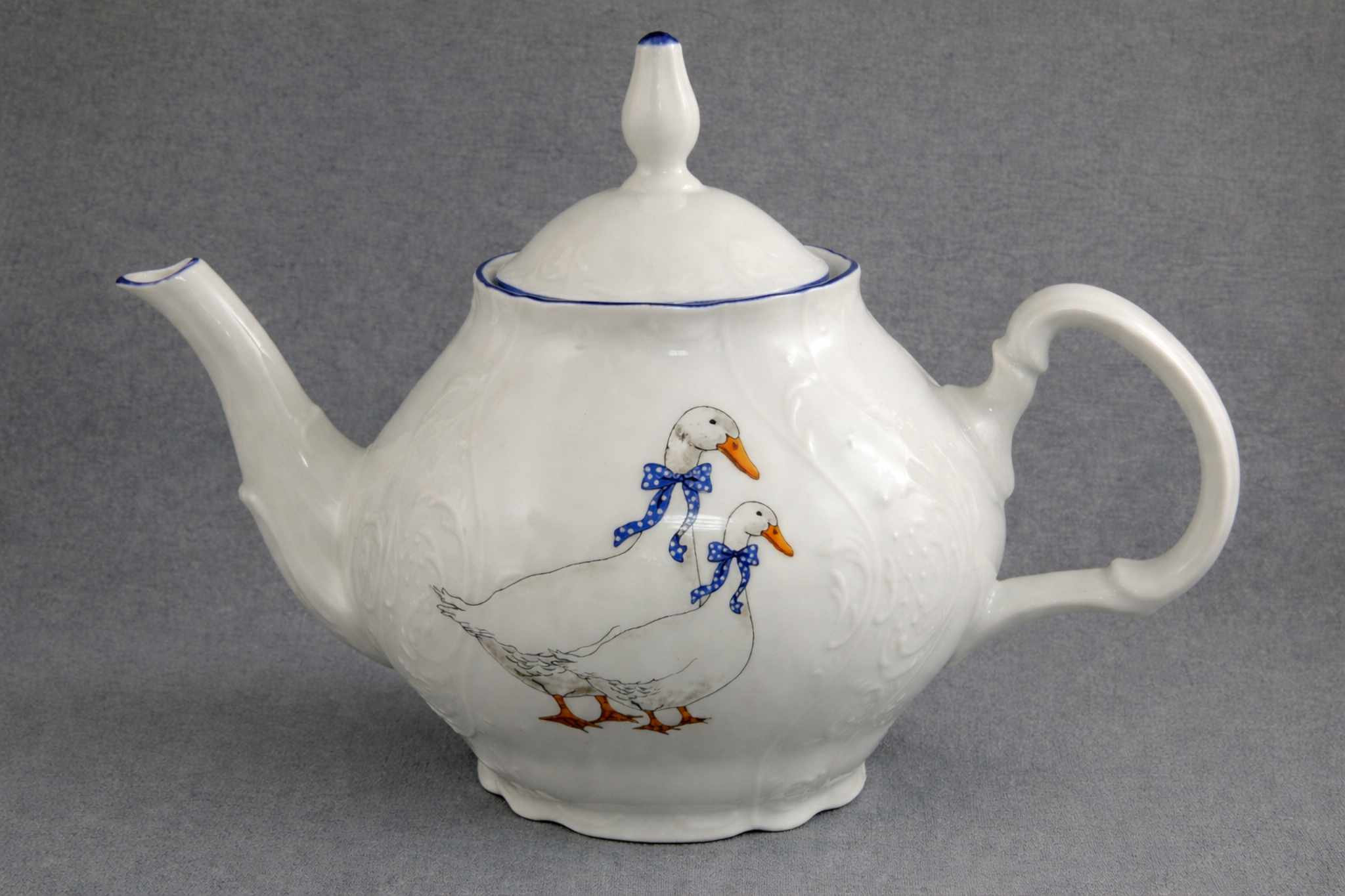 Чайник фарфоровый белый с рисунком Bernadotte Гуси 1.2 л с синей каёмочкой