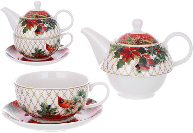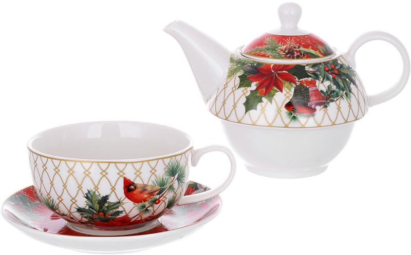 Рождественский чайный набор на одну персону «Сияние Праздников» включает в себя чайник-заварник объемом 350 мл, яркую чашку на 300 мл и блюдце размером 15,5х2 см.