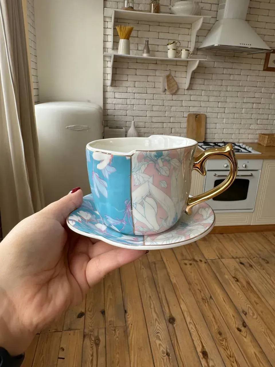 Высококачественный фарфор обеспечивает долговечность и устойчивость к ежедневному использованию, сохраняя безупречный блеск и красоту рисунка. Изогнутая позолоченная ручка придаёт чашке изысканности и подчеркивает её декоративную ценность.