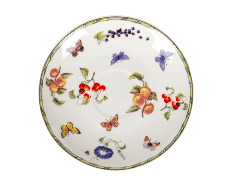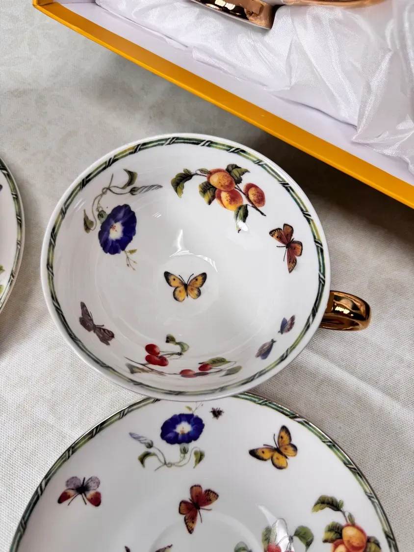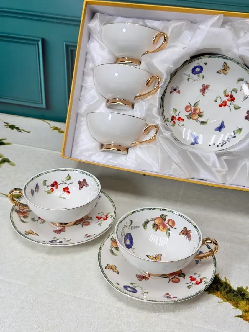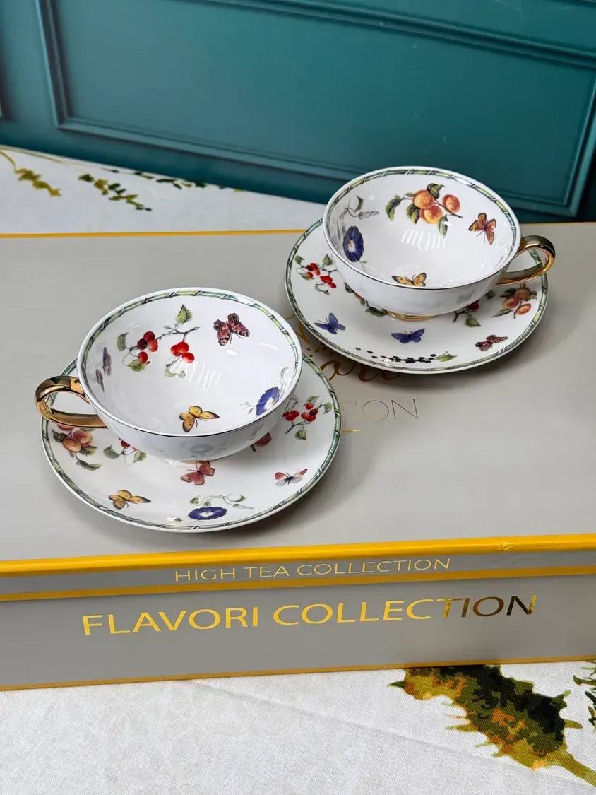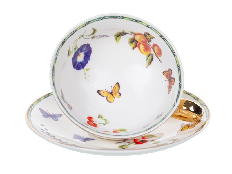 Коллекция чайных пар Garden Symphony — это воплощение летнего настроения и природной гармонии. Утончённые рисунки с цветами, ягодами, бабочками и зеленью словно переносят вас в сад, наполненный ароматами и солнечным светом. Золотые элементы на ручках и ножках чашек добавляют нотку торжественности, а изящная форма придаёт всей коллекции аристократический вид.