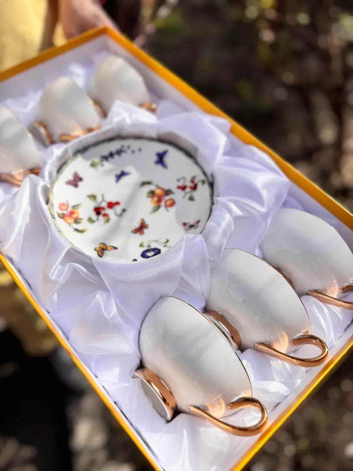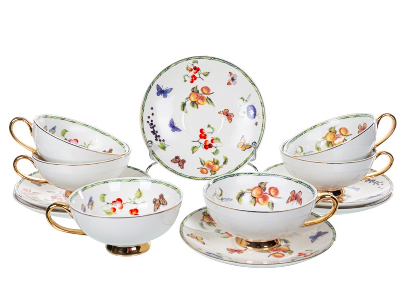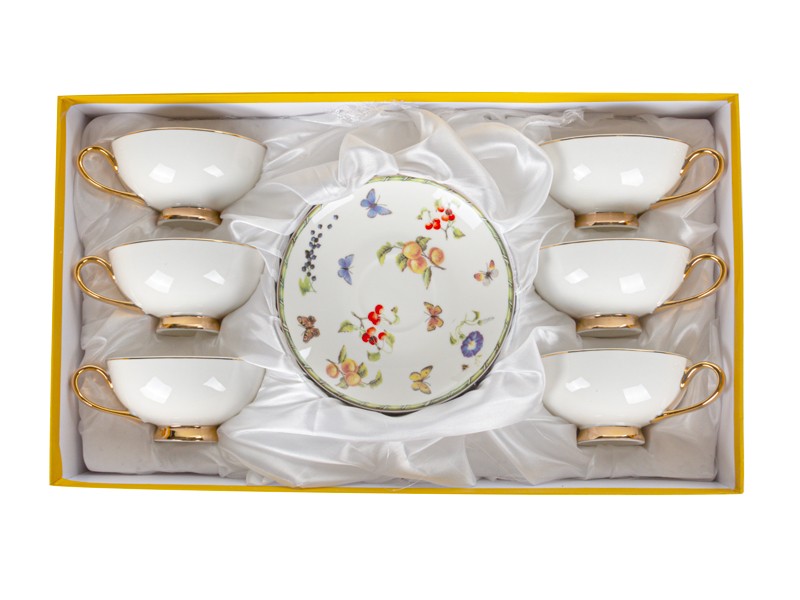 Набор на 12 предметов (6 пар) — это полноценное сервировочное решение для приёмов гостей, праздничных чаепитий и семейных вечеров. Набор создаёт эффект роскоши и лёгкости одновременно: воздушные цветочные мотивы на белоснежном фарфоре дополняются блеском золотых деталей. Благодаря высококачественному фарфору изделия долговечны, устойчивы к повседневному использованию и не теряют яркости рисунка с течением времени.