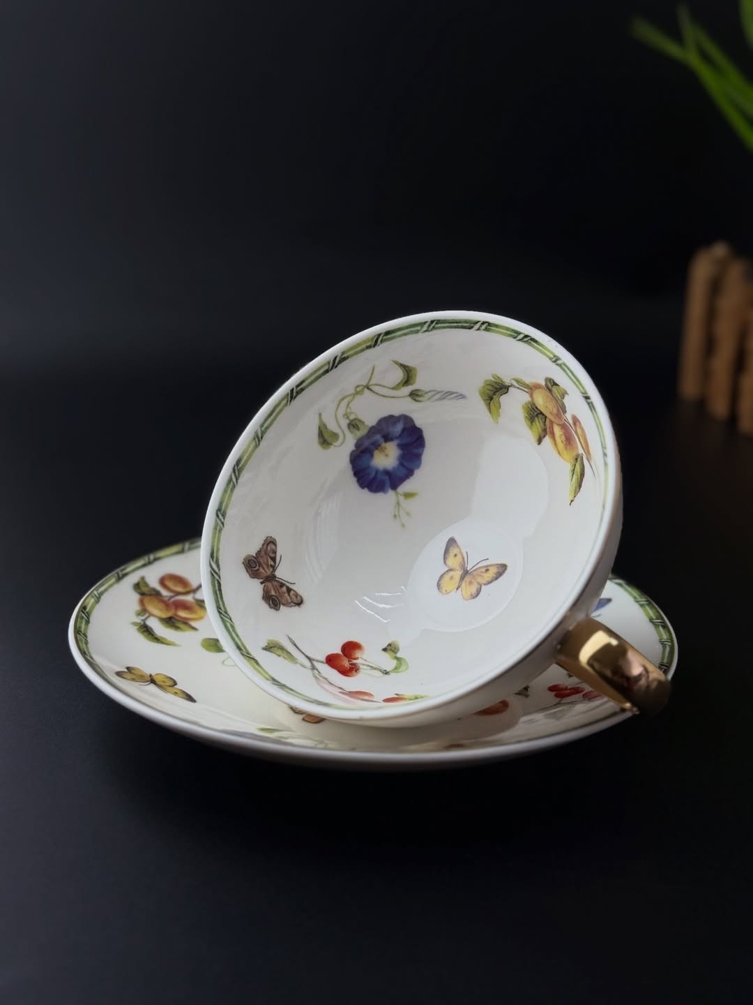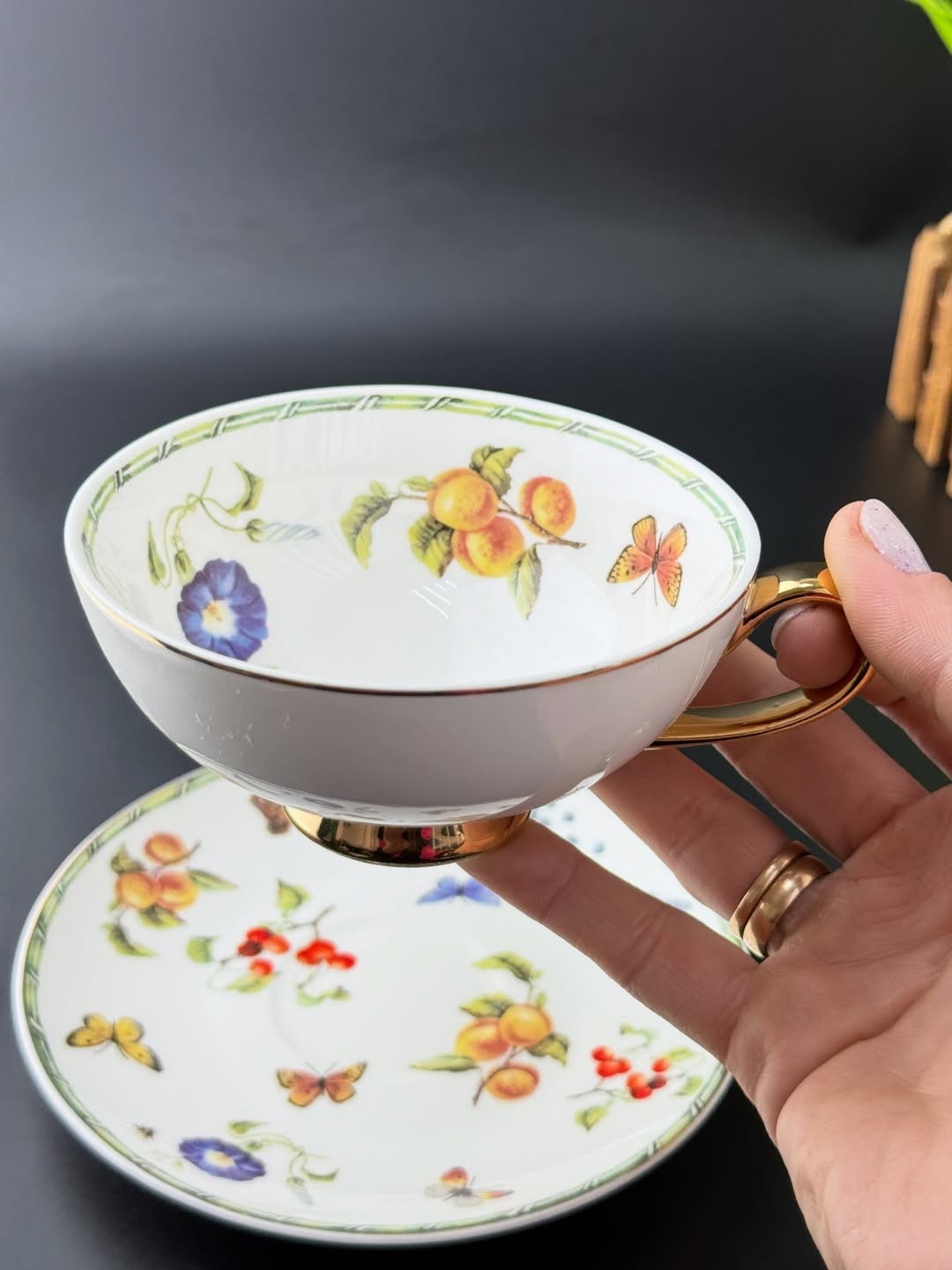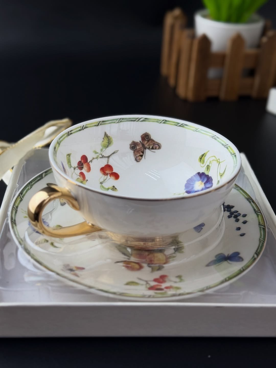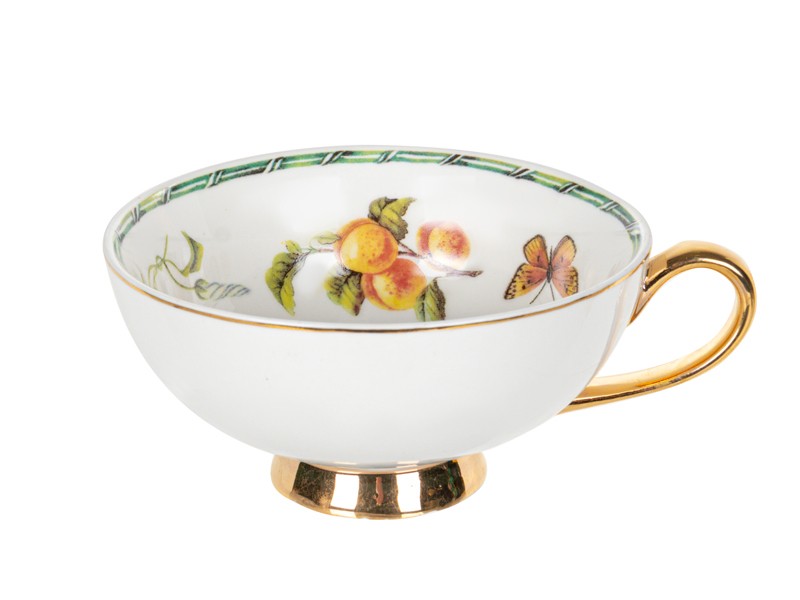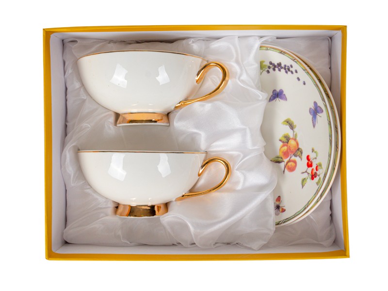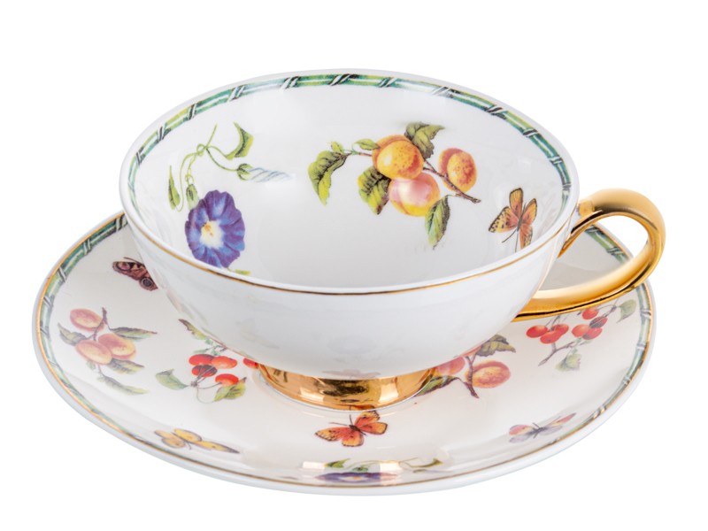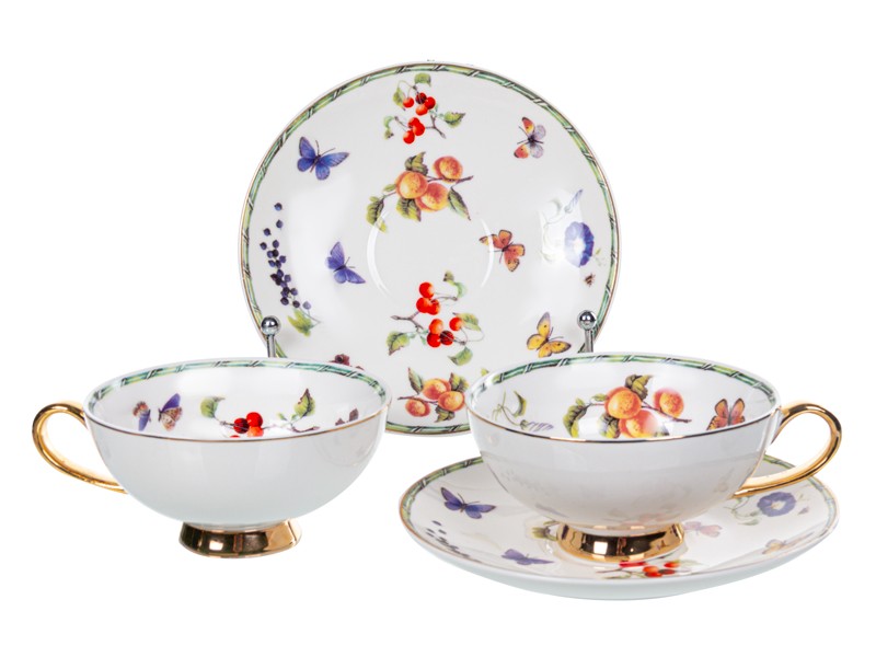 Коллекция чайных пар Garden Symphony — это воплощение летнего настроения и природной гармонии. Утончённые рисунки с цветами, ягодами, бабочками и зеленью словно переносят вас в сад, наполненный ароматами и солнечным светом. Золотые элементы на ручках и ножках чашек добавляют нотку торжественности, а изящная форма придаёт всей коллекции аристократический вид.