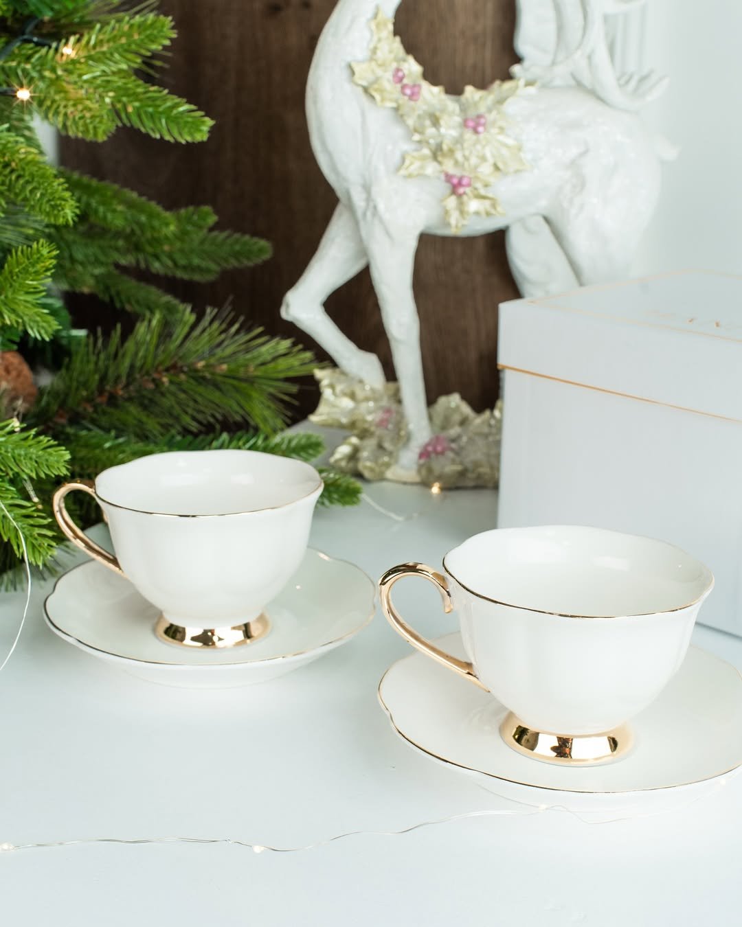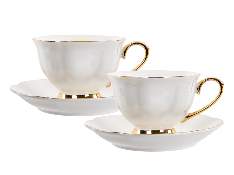 Чашки об’ємом 220 мл зручно лежать у руці та дозволяють насолоджуватися улюбленими напоями сповна. Блюдця гармонійно доповнюють композицію, роблячи сервірування завершеним. Легкий блиск золота надає сервізу благородного характеру та підкреслює його статусність.