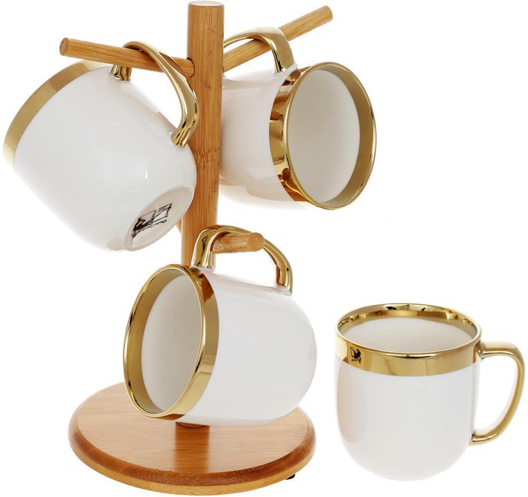 Это функциональная и удобная посуда, оригинальный декор для Вашей кухни или столовой. Кружка из фарфора белого цвета с яркой золотой каймой. Большие удобные ручки золотистого цвета. Подставка из прочного натурального влагостойкого бамбука – удобна для сушки и хранения кружек. Набор упакован в подарочную картонную коробку.