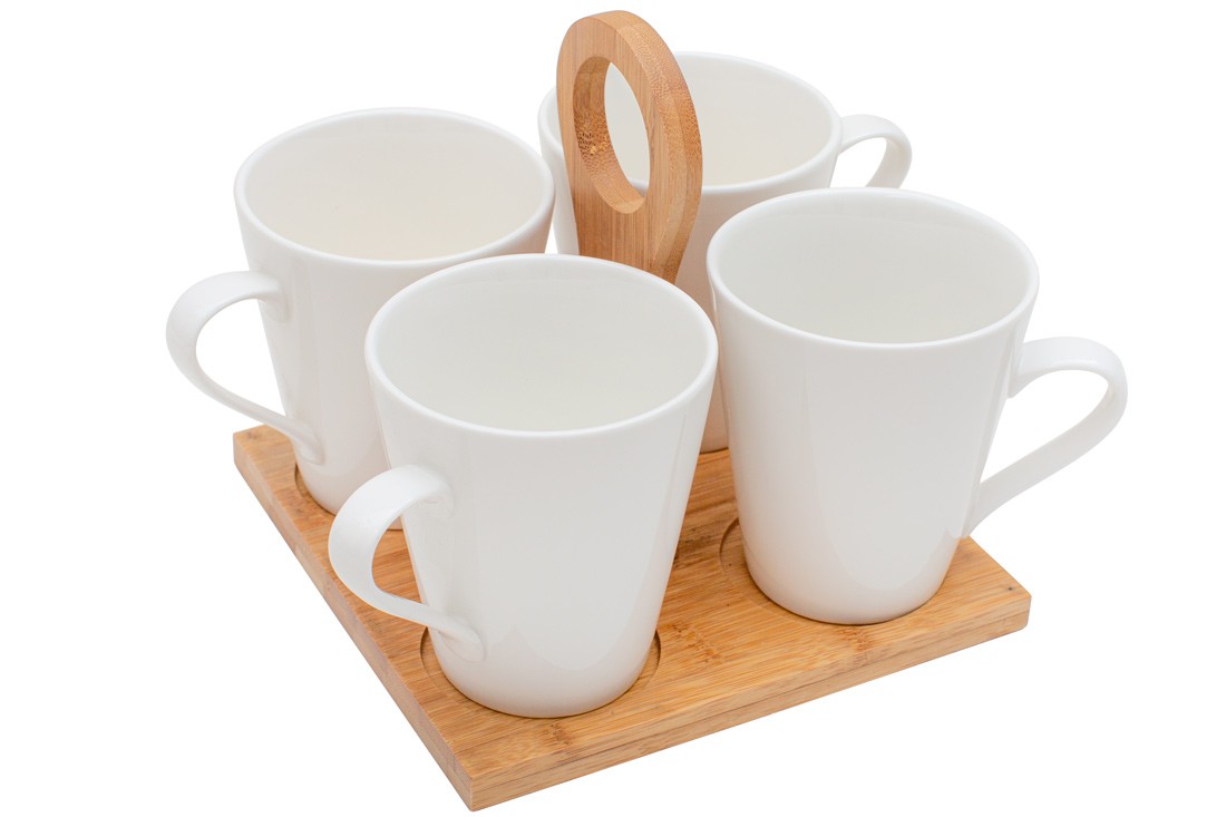 4 кружки з білосніжної порцеляни на підносі-підставці зі світлого натурального вологостійкого бамбука.