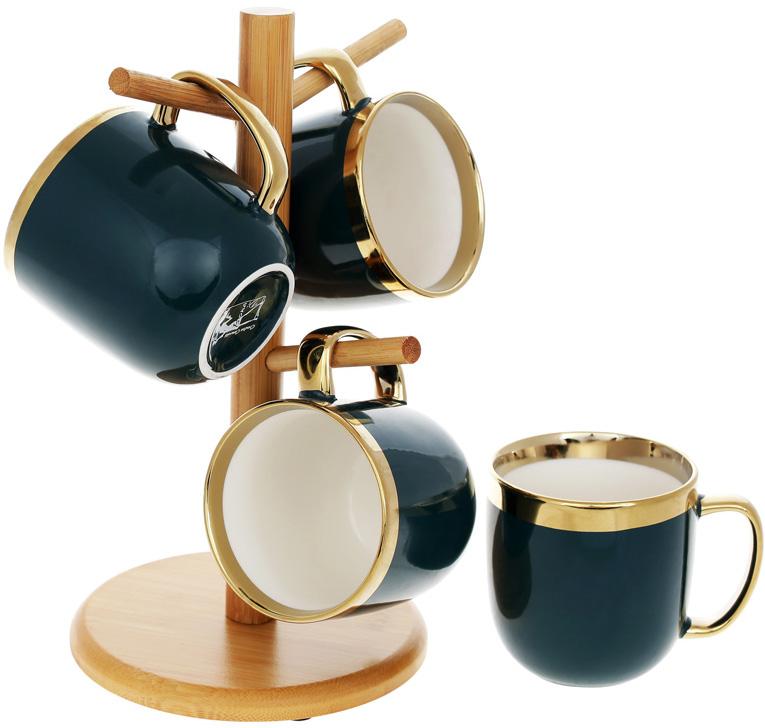 Это функциональная и удобная посуда, оригинальный декор для Вашей кухни или столовой. Чашки с фарфором цвета розовой пудры с яркой золотой каймой. Большие удобные ручки, тоже золотистого цвета. Подставка из прочного натурального влагостойкого бамбука – удобна для сушки и хранения кружек. Набор упакован в подарочную картонную коробку.