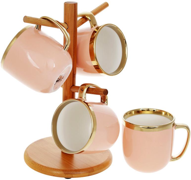 Это функциональная и удобная посуда, оригинальный декор для Вашей кухни или столовой. Чашки с фарфором цвета розовой пудры с яркой золотой каймой. Большие удобные ручки, тоже золотистого цвета. Подставка из прочного натурального влагостойкого бамбука – удобна для сушки и хранения кружек. Набор упакован в подарочную картонную коробку.