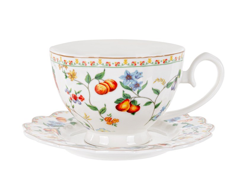 Чайний набір Lefard на 2 особи (4 предмети, 250 мл) — це прекрасний дует порцелянових чашок і блюдець, створений для затишних миттєвостей удвох. Білосніжна порцеляна прикрашена вишуканим малюнком із квітами, зеленим листям та соковитими ягодами, що ніби переносять у літній сад, сповнений аромату свіжості. Легкі хвилясті краї блюдець додають сервіруванню витонченості, а зручна форма чашок робить чаювання особливо приємним.