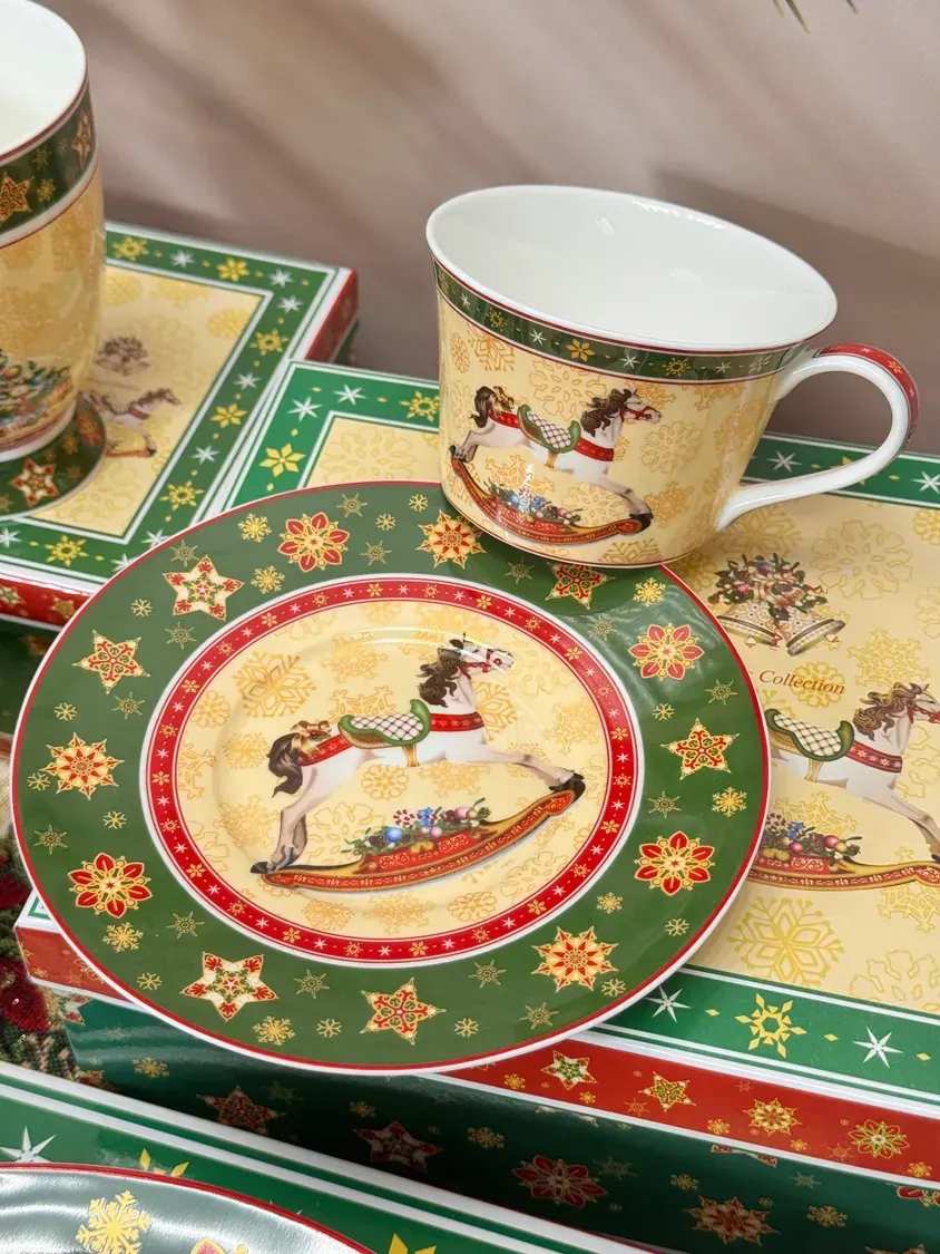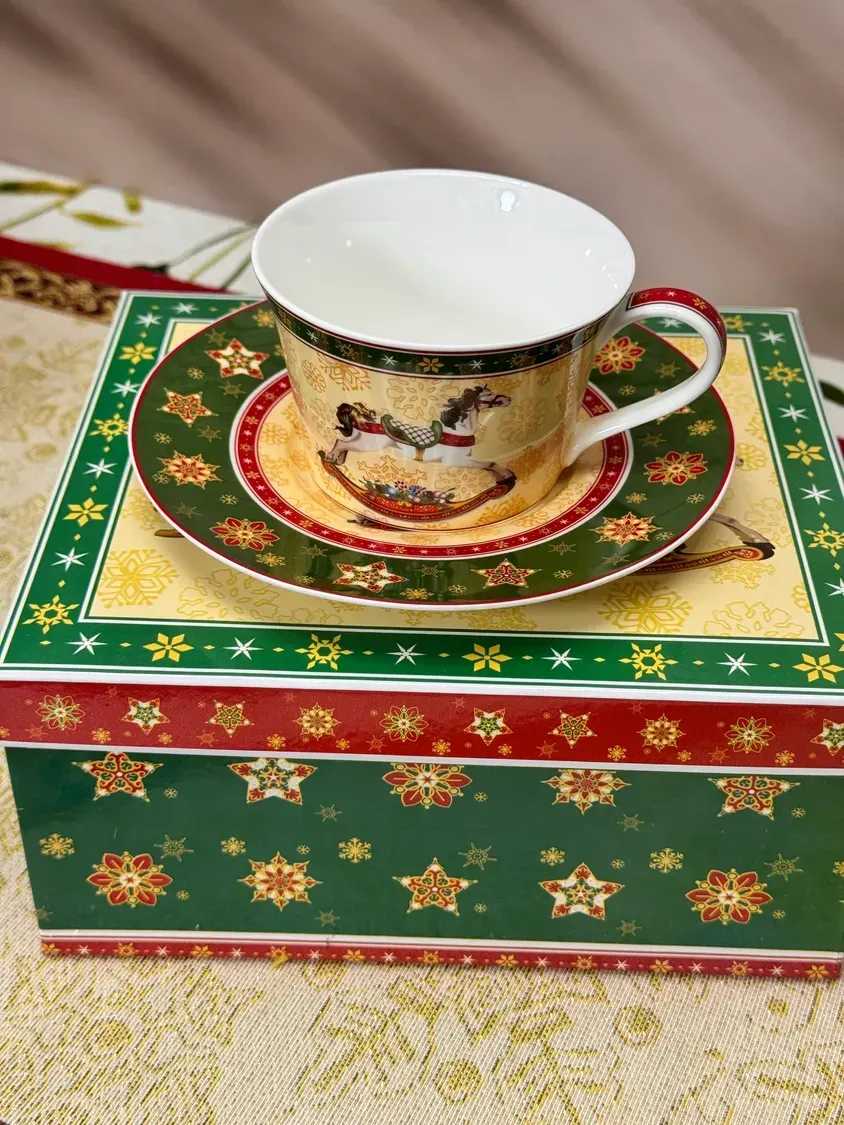 Фарфоровый чайный набор Christmas Collection — это символ уюта и праздничного тепла. Изящная чашка объёмом 180 мл и блюдце украшены рисунком с лошадкой-качалкой, который вызывает тёплые воспоминания о детстве, ожидании подарков и зимних вечерах. Яркое сочетание зелёного, красного и золотого оттенков создаёт атмосферу праздника, превращая обычное чаепитие в особенный момент.