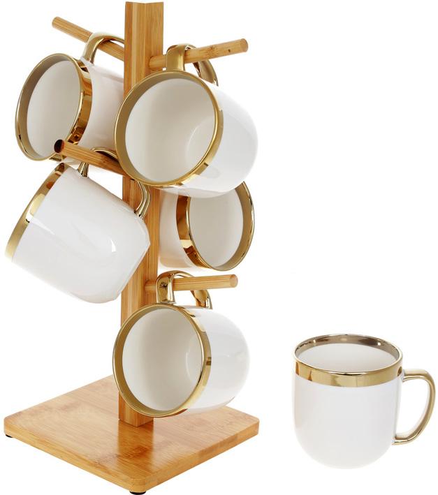 Это функциональная и удобная посуда, оригинальный декор для Вашей кухни или столовой. Кружка из фарфора белого цвета с яркой золотой каймой. Большие удобные ручки золотистого цвета. Подставка из прочного натурального влагостойкого бамбука – удобна для сушки и хранения кружек. Набор упакован в подарочную картонную коробку.