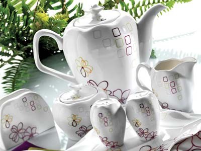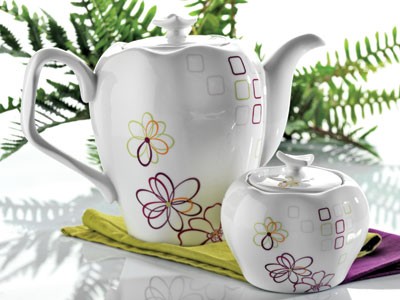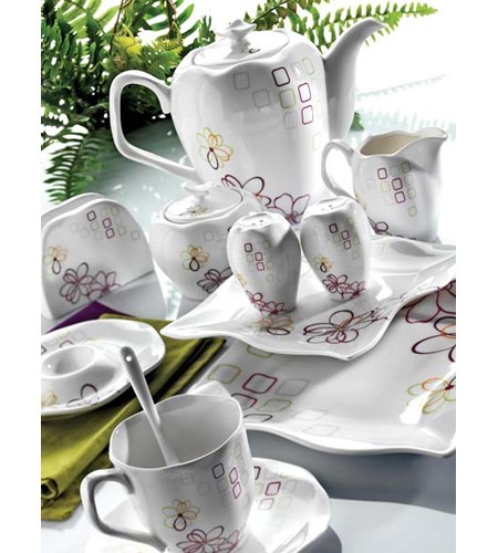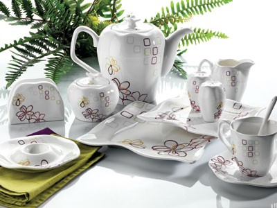 Сервиз для завтрака из белоснежного костяного фарфора с оригинальным ярким рисунком. Это больше, чем чайный сервиз, помимо чайных чашек, блюдец и заварочного чайника, в этом сервизе есть сервировочные и мелкие тарелки и пашотницы.
