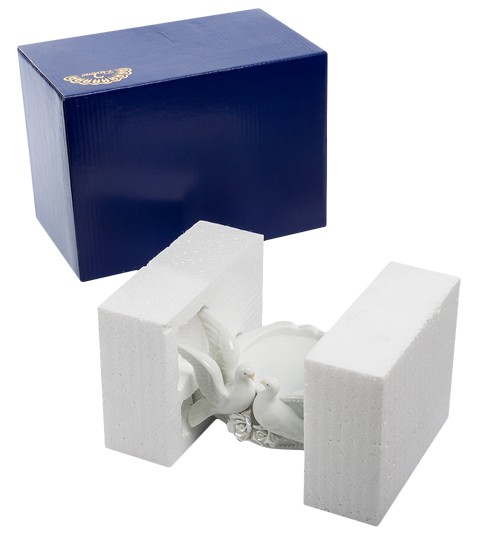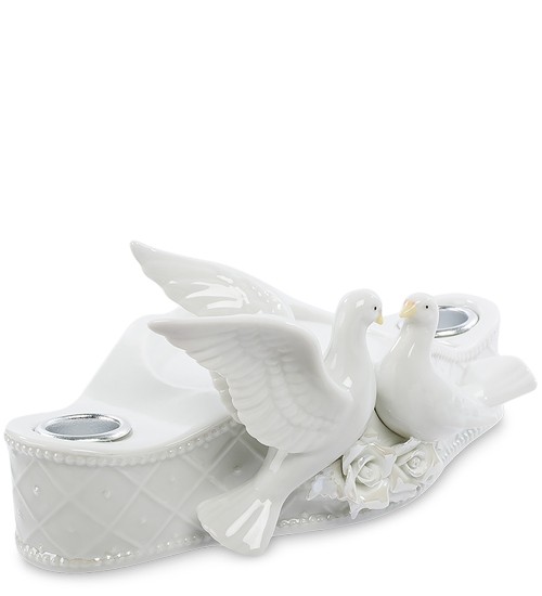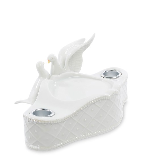 Подсвечник с двумя голубями - белого цвета. Два любящих голубка целуются и дорожат друг другом. Голуби сидят на белых бутончиках цветков. Свечки ставятся с двух сторон в специальные отверстия. Вся композиция выполнена в белом цвете.