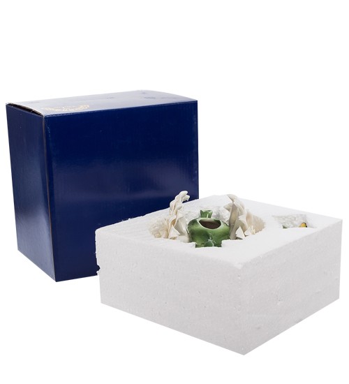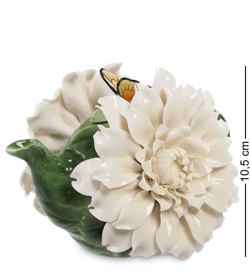 Этот заварочный чайник как будто решил спрятаться между роскошных цветов. Две белые хризантемы прикрыли его корпус так, что из-за них видны только носик и ручка, выкрашенные в зеленый цвет, как цветочные стебли. Да вверху между цветами присела на крышку чайника золотистая бабочка, которая имеет особое назначение – взявшись за нее, можно открыть крышку и загрузить в чайник порцию чая. Похоже, даже обычный чай приобретет аромат цветов, если его заварить и разлить по чашкам из этого чайника. А о том, что чайник украсит собой стол, за которым происходит чаепитие, и говорить не стоит. Просто, в лучшем стиле китайских традиций, к вкусу и аромату чая добавится еще и красота цветов!