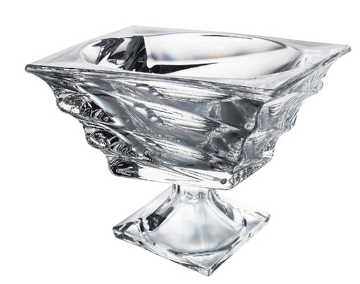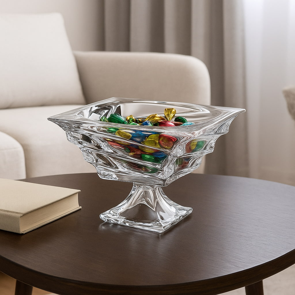 Ця цукерниця — справжній витвір чеського скляного мистецтва. Глибока чаша з геометричними гранями та стійка ніжка створюють елегантний, врівноважений силует. Вона ніби вирізана з прозорого кришталю, що застиг у русі. Світло грає на кожному вигині, створюючи розкішну гру відблисків.