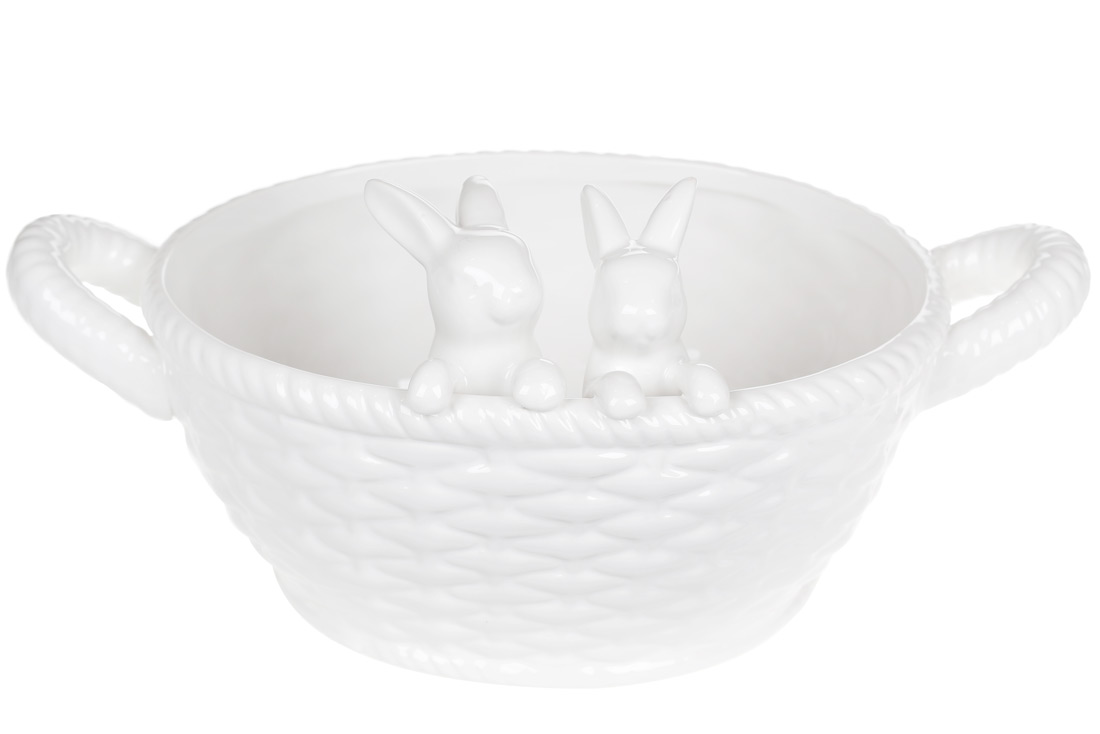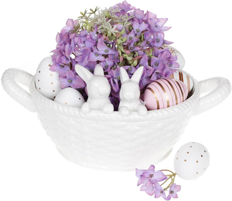 Колекція Silent Spring — це втілення весняного затишку та витонченого стилю. Декоративне кашпо з високоякісної кераміки стане яскравим акцентом у великодньому інтер'єрі та тішитиме око не один сезон. Два білосніжні кролики, наче казкові охоронці, тримають елегантний кошик, у який можна покласти живі квіти, декоративні писанки або святкові смаколики. Кераміка робить виріб не лише естетично привабливим, а й практичним — вона довговічна, легка у догляді та чудово зберігає форму.