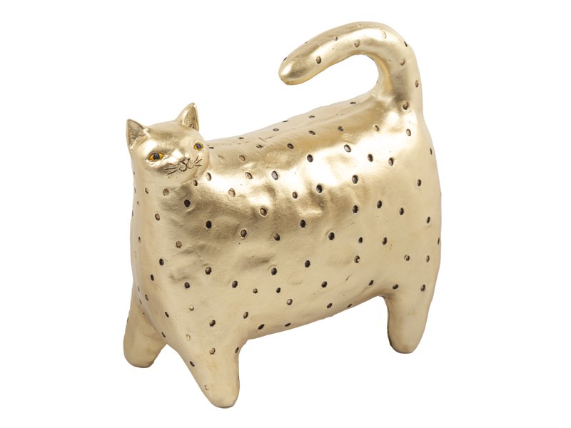Золотое покрытие с точечным узором создаёт игру бликов и подчеркивает фактуру материала. Такая фигурка отлично впишется в любой интерьер — от минималистичного до эклектичного — и станет стильным акцентом на полке, камине или журнальном столике.