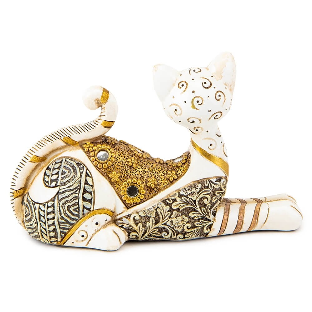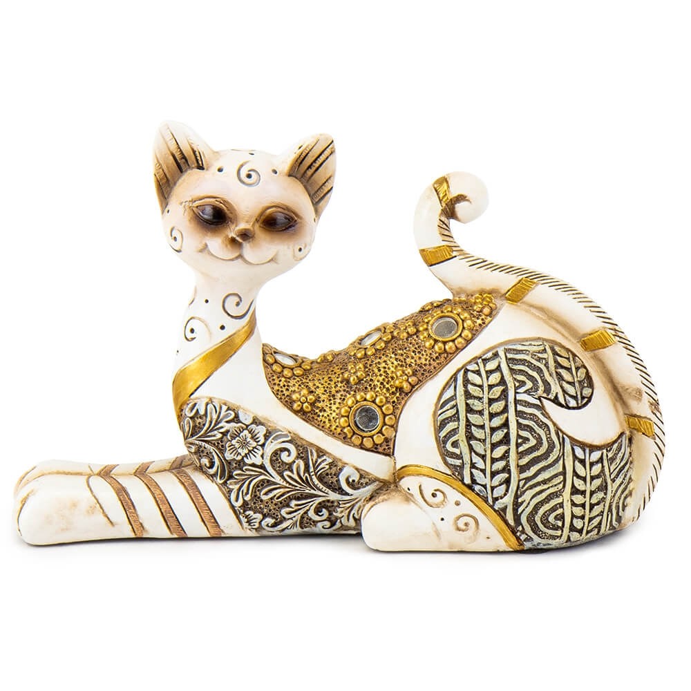 Декоративная статуэтка кошки - это элегантная, изысканная фигурка из полистоуна, которая идеально подойдет для подарка творческой натуре, друзьям, коллеге. Статуэтка в этническом стиле очень красива и украсит любой интерьер. Она изготовлена из высококачественного полистоуна, имеет благородный вид - статуэтка белого цвета с золотыми этно узорами и зеркальными камушками. Фигурка устойчиво стоит.