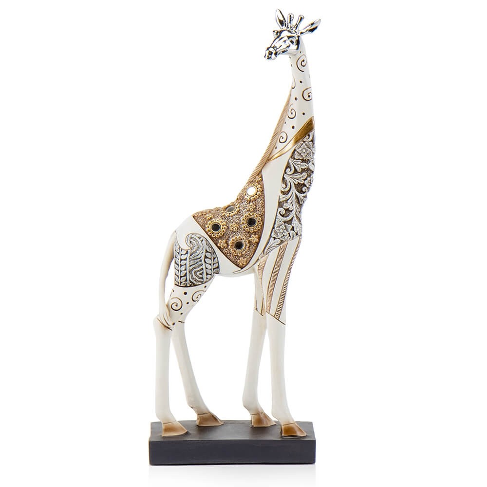 Декоративная статуэтка жирафа - это элегантная, изысканная фигурка из полистоуна, которая идеально подойдет для подарка творческой натуре, друзьям, коллеге. Статуэтка жирафа в этническом стиле очень красива и украсит любой интерьер. Она изготовлена из высококачественного полистоуна, имеет благородный вид - статуэтка белого цвета с золотыми этно узорами и зеркальными камушками. Фигурка устойчиво стоит.