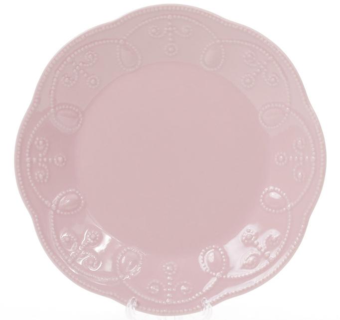 В наборе 6 круглых плоских тарелок из каменной керамики, Красивая и качественная посуда для интенсивного домашнего и профессионального использования, Розовая керамика с объемным декором: вензель Королевская лилия в стиле Shabby Chic (Шаби Шик),