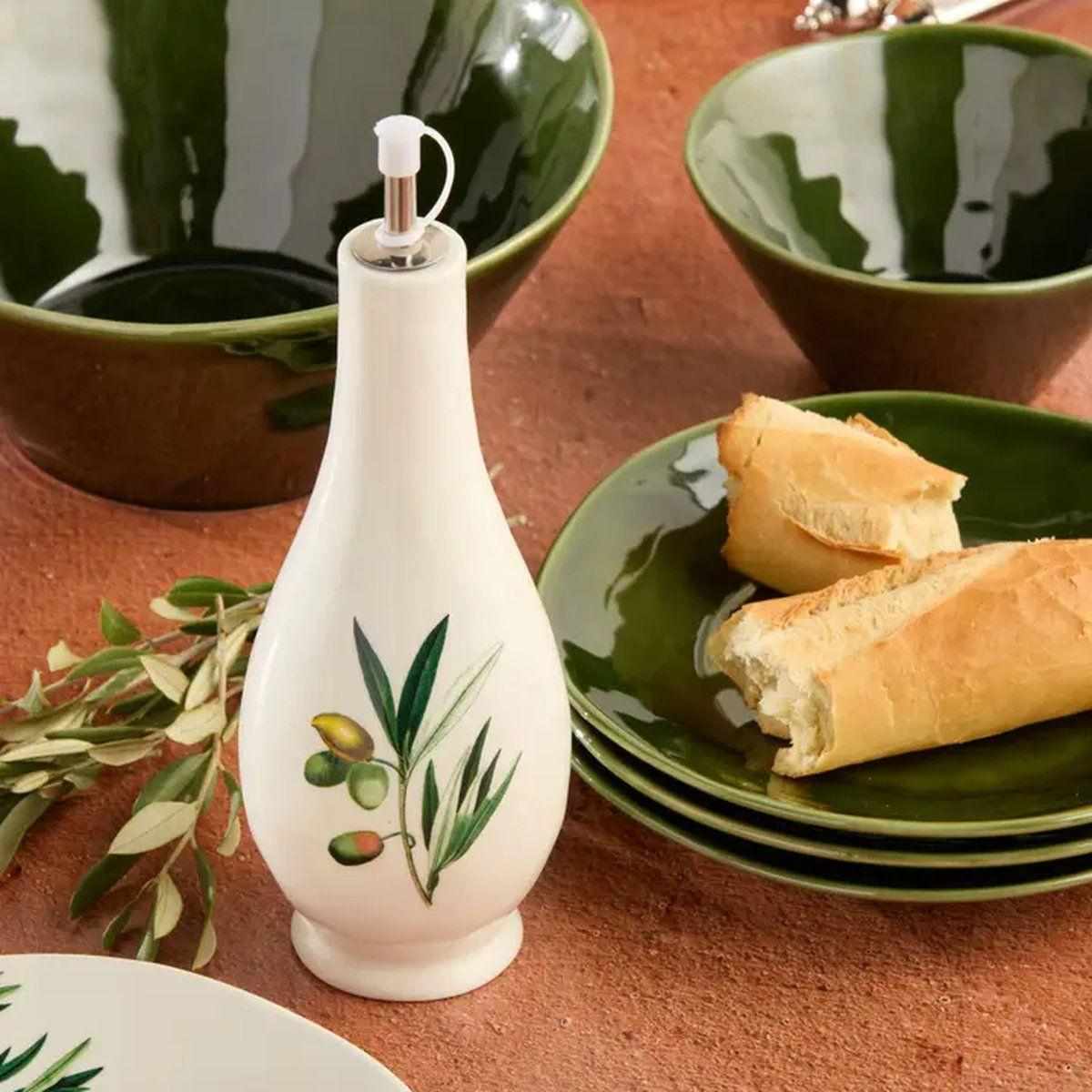 Цей стильний диспенсер з витонченим малюнком оливкових гілок миттєво привертає увагу і перетворює подачу олії на справжню прикрасу столу. Його м'які лінії і витончена форма створюють відчуття середземноморського затишку і роблять аксесуар ідеальним для щоденного використання та ефектних сервірувань. Посуд можна мити в посудомийній машині і використовувати в мікрохвильовій печі для розігріву, не рекомендується використовувати засоби для чищення з абразивними частинками — і це робить догляд за диспенсером простим і безпечним. Завдяки об'єму 600 мл він вміщує достатньо олії, щоб завжди бути під рукою під час приготування або подачі страв. Керамічна поверхня надійна, приємна на дотик і підкреслює натуральний стиль кухні. Такий аксесуар надихає готувати із задоволенням і стане чудовим подарунком для поціновувачів красивого посуду.