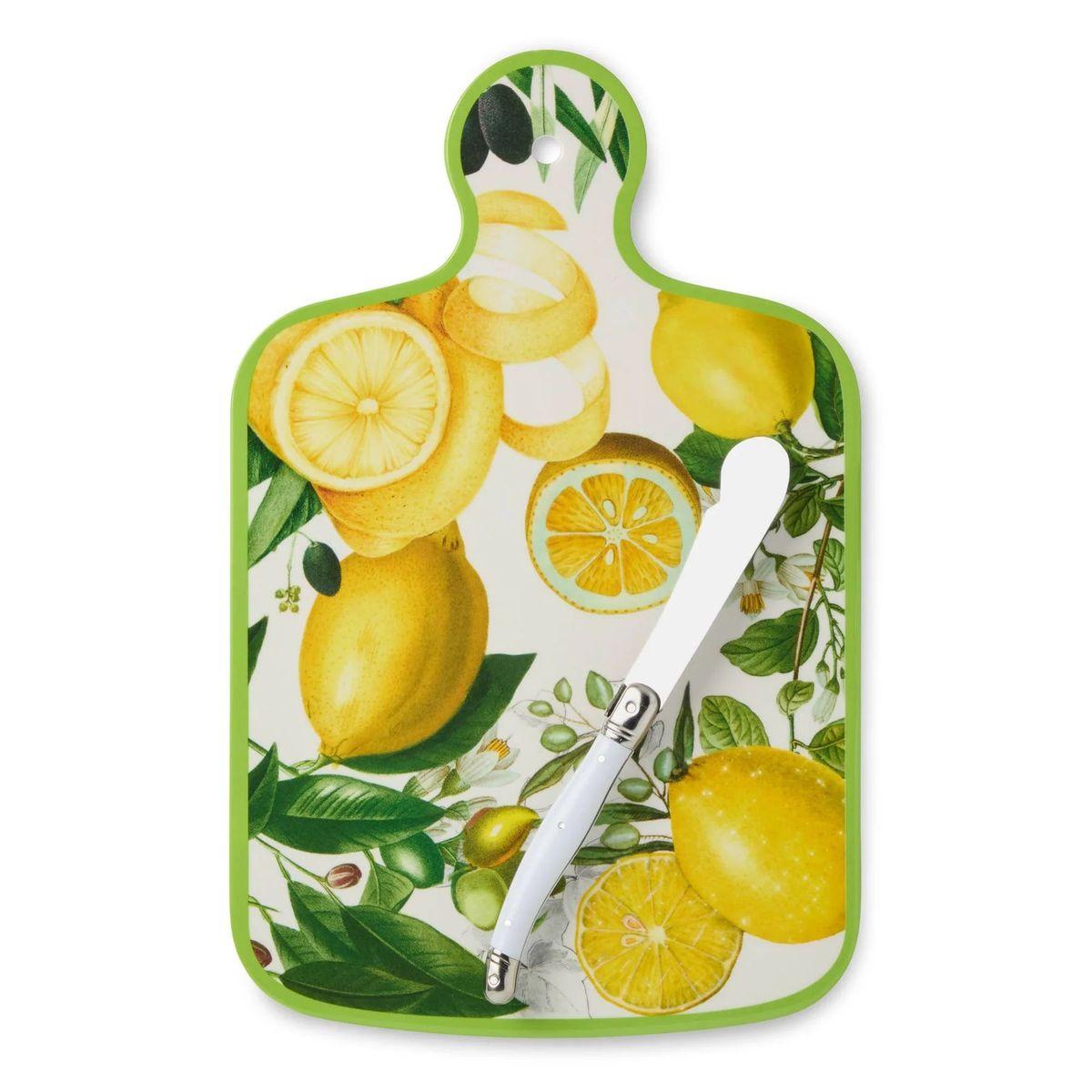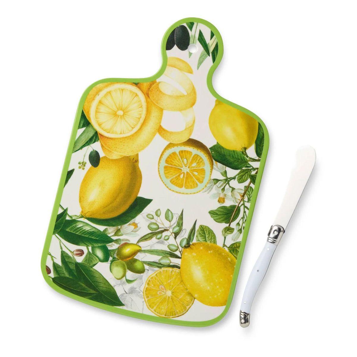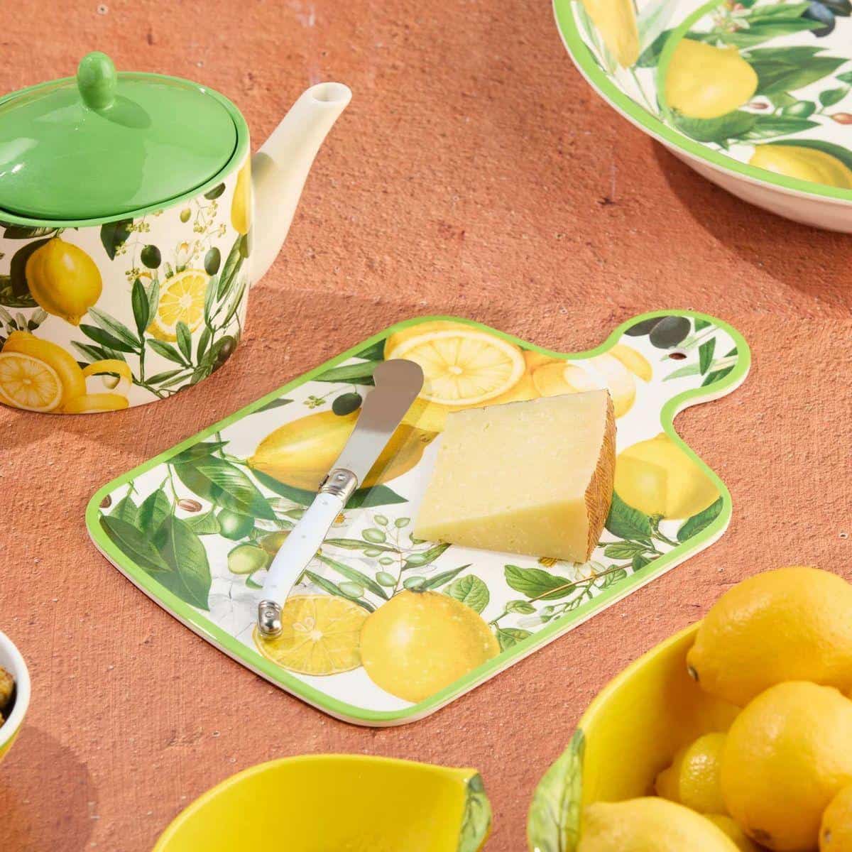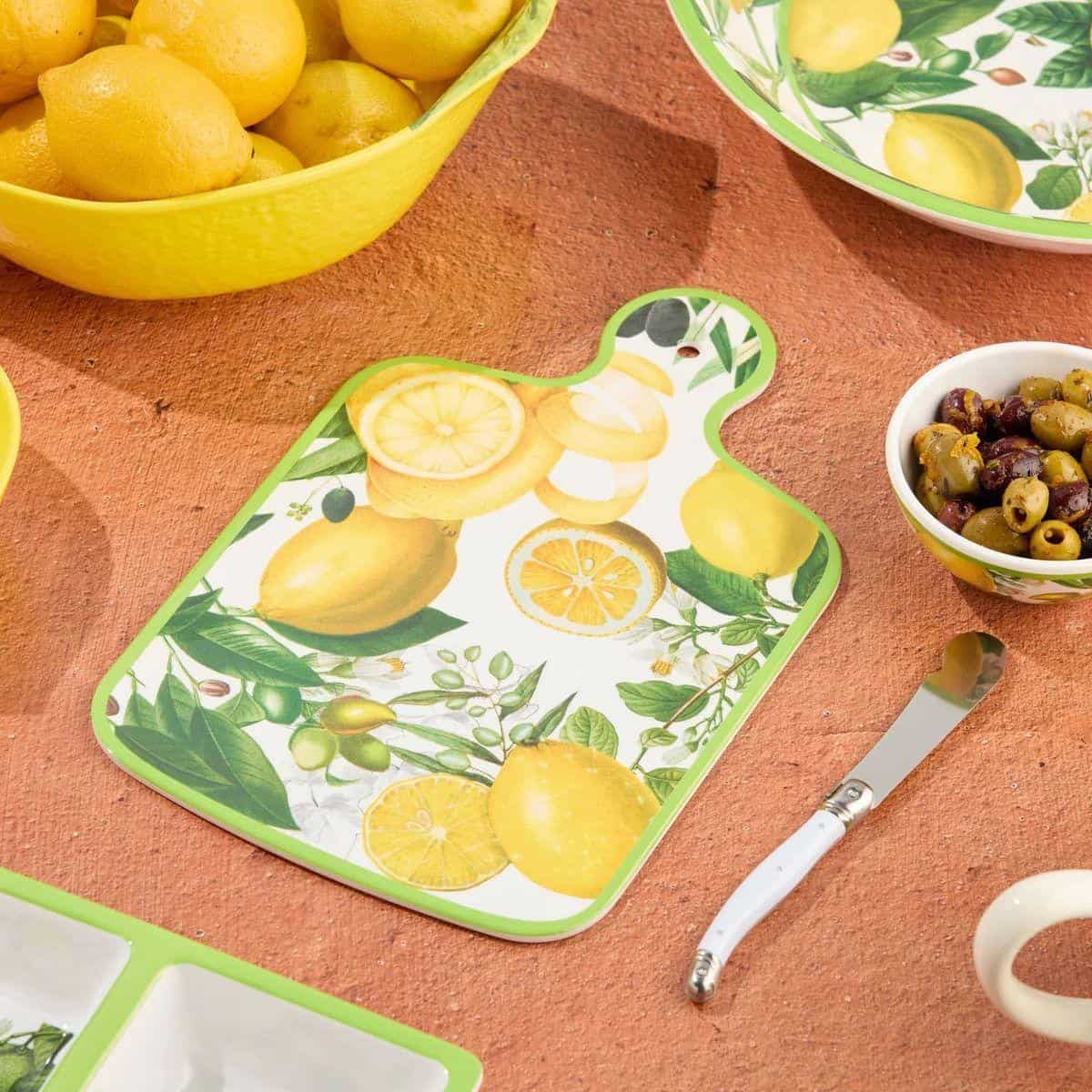 Меламиновая доска для сыра «Лимоны и оливки» Certified International — это стильный аксессуар для красивой подачи закусок. Яркий рисунок с лимонами и оливками напоминает атмосферу итальянского ужина на террасе. В комплект входит удобный нож, подходящий для мягких и твердых сыров. Легкий и прочный меламин не впитывает запахи, не бьётся и легко моется. Доска идеально подходит для сыра, фруктов, орехов и канапе. Такой набор станет эффектным подарком и украшением вашего стола.