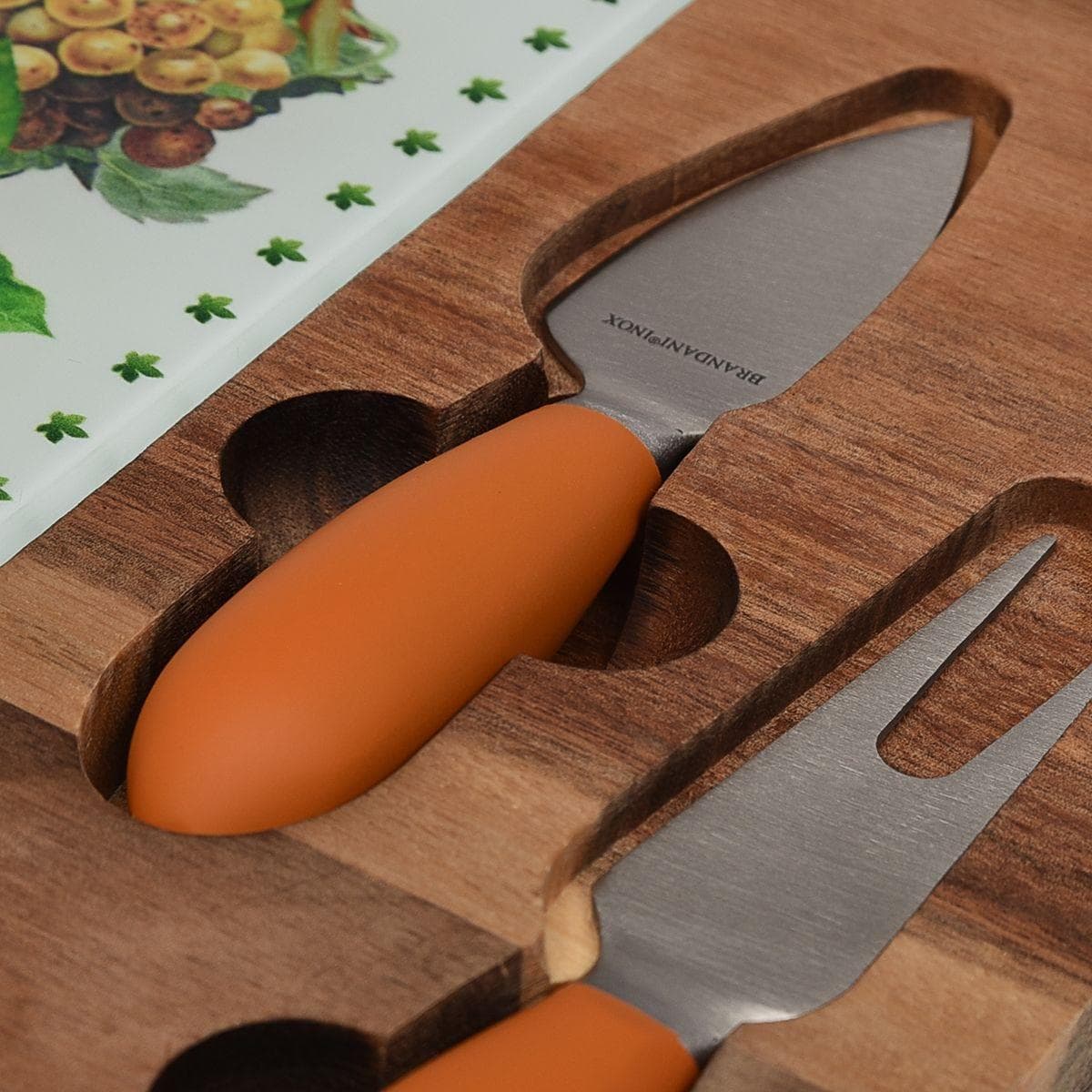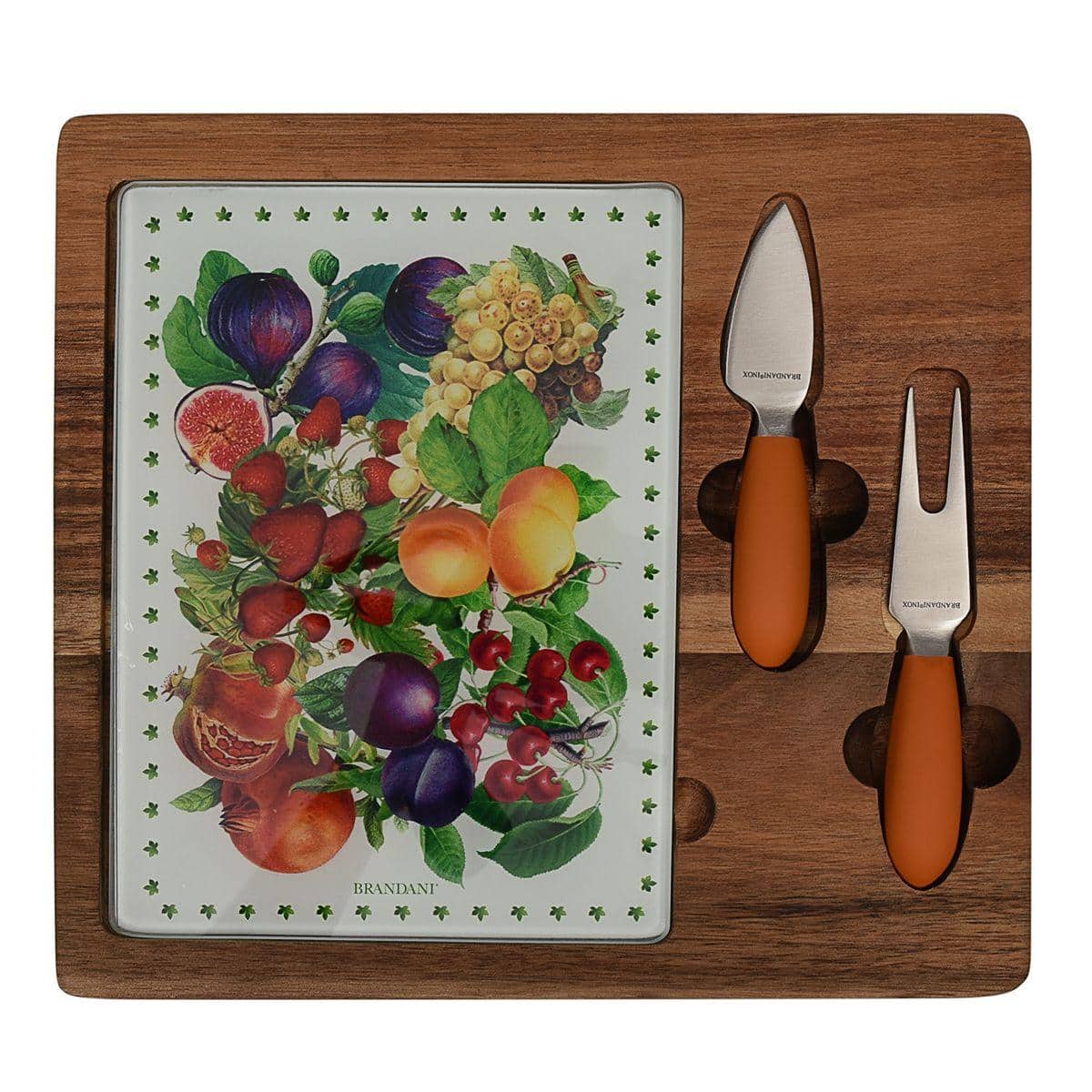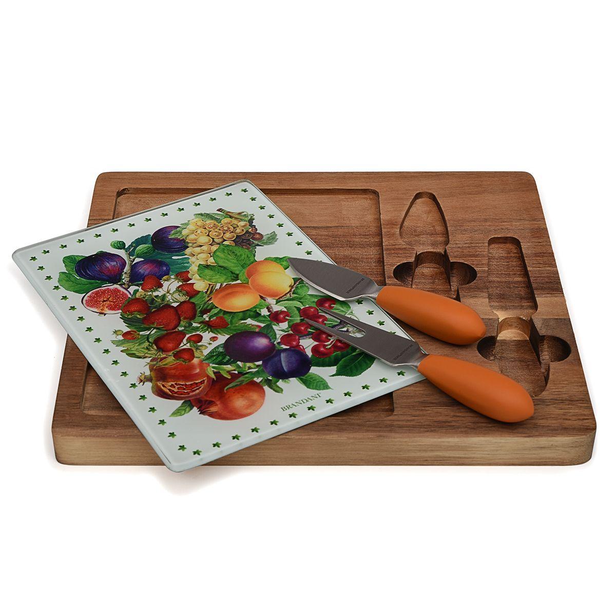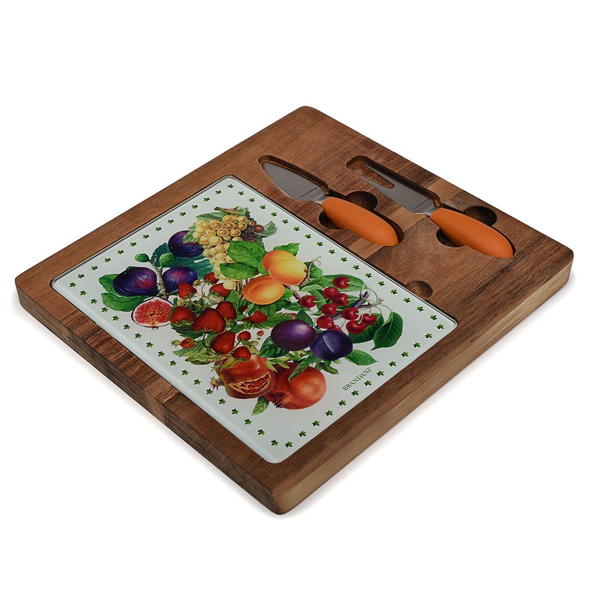 Сыр – особое блюдо, которое заслуживает особой презентации. Именно такую: на яркой цветной картинке, в оправе из темного дерева, со специальными удобными приборами. Стеклянная поверхность украшена фруктовым натюрмортом, который невозможно повредить при нарезании металлическим лезвием. Деревянная основа сделана из отполированной до гладкости акации. Доска для нарезки – из крепкого толстого стекла, которое можно вынуть из ниши. Приборы изготовлены из нержавеющей стали.