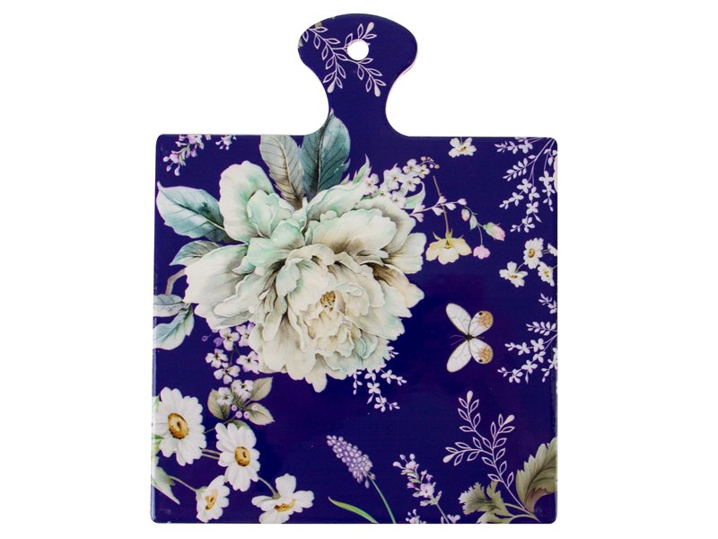 Сервірувальна дошочка Fleur 19 см – це не просто кухонний аксесуар, а справжня декоративна знахідка. Насичений синій фон, витончені білі півонії та легкі метелики створюють атмосферу вишуканості й перетворюють звичайну сервіровку на стильне оформлення столу.