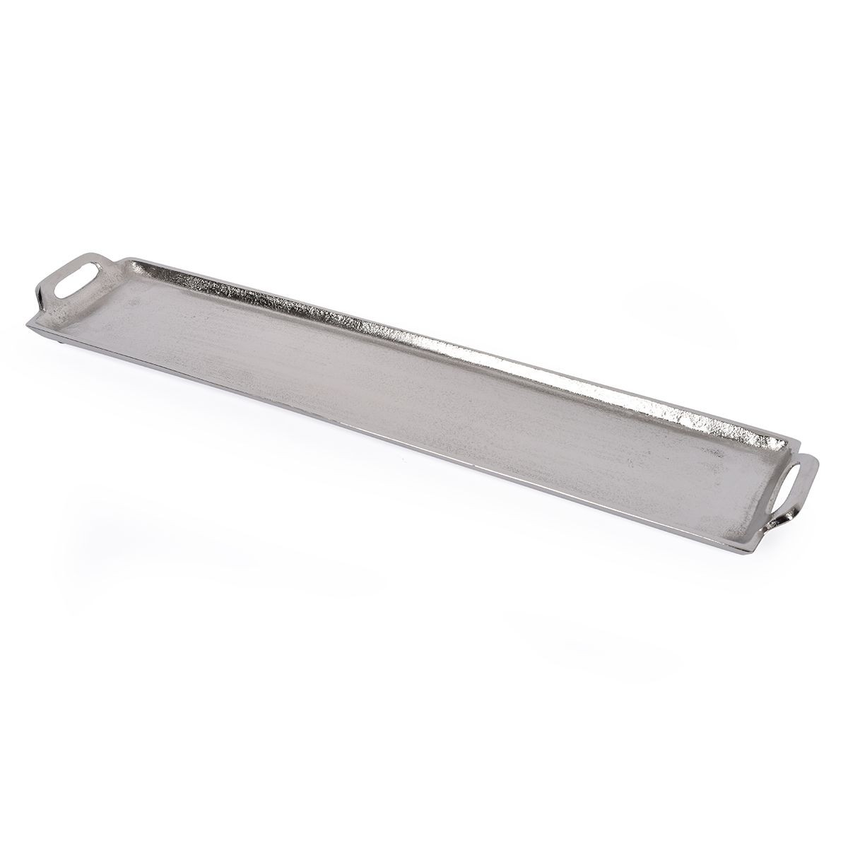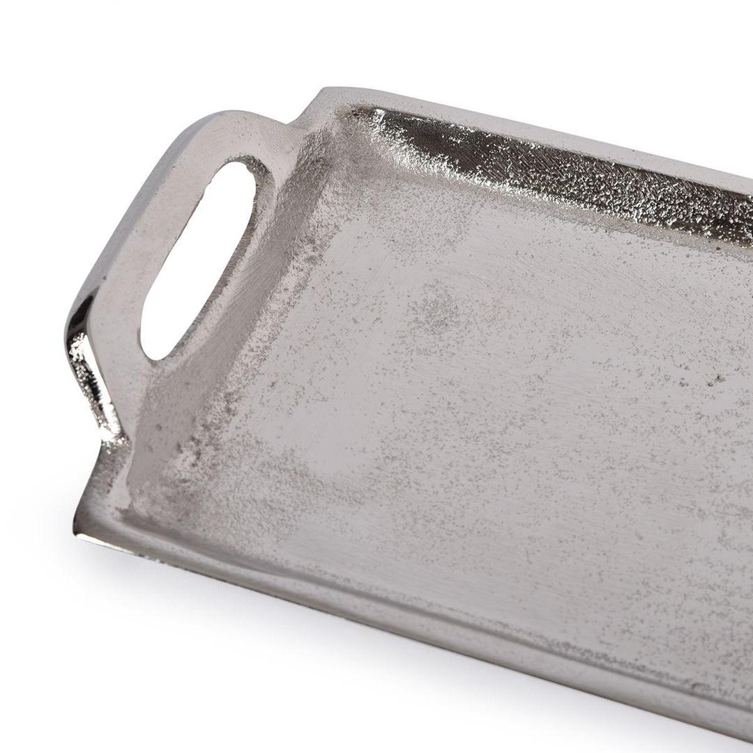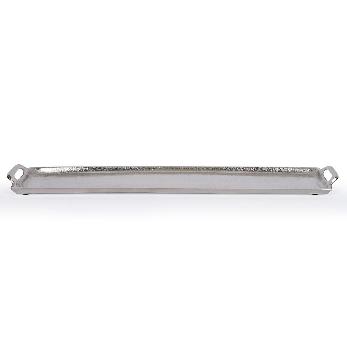 Ця довга таця виготовлена з легкого алюмінію та поєднує в собі міцність, мінімалізм і універсальність. Її витягнута форма робить виріб зручним для подачі закусок, фруктів, десертів або сервірування столу. Невеликі бокові ручки забезпечують комфортне утримання та додають аксесуару виразний декоративний акцент. Металева фактура з м’яким сріблястим блиском виглядає стильно та легко вписується в сучасний інтер’єр. Розмір 63×13×3 см дозволяє використовувати тацю як удома, так і для святкової подачі. Це практичний і елегантний елемент сервірування, який допомагає створити акуратну та ефектну композицію.