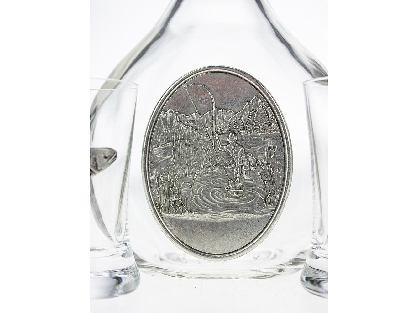 Зверніть увагу на олов'яну табличку з барельєфом РИБАКА на риболовлі, прикріплену посередині графина. Створення подібного барельєфу – процес дуже трудомісткий. В Австрії, спочатку виробляється металева форма, в якій в подальшому виливають олов'яні табклички - німецькою їх називають ШИЛЬДИ з малюнками, чи то репродукціями відомих майстрів мистецтв. На шильді ми бачимо зображення Рибалки, що дістає виловлену рибу з озера, навколо гористо-лісиста місцевість, що навиває настрій і передчуття відпочинку на лоні природи.