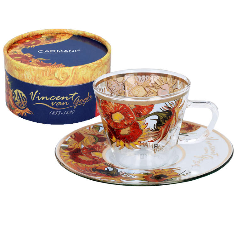 На чашке и блюдце изображены узнаваемые золотисто-оранжевые подсолнухи, полные жизни и света. Эта работа художника давно стала символом тепла, солнца и творческой энергии — и теперь её можно держать в ладонях. Каждая деталь продумана до мелочей: цветовая палитра, позолоченные акценты, композиция узора — всё это придаёт изделию статус подарочного и коллекционного.