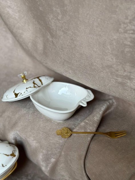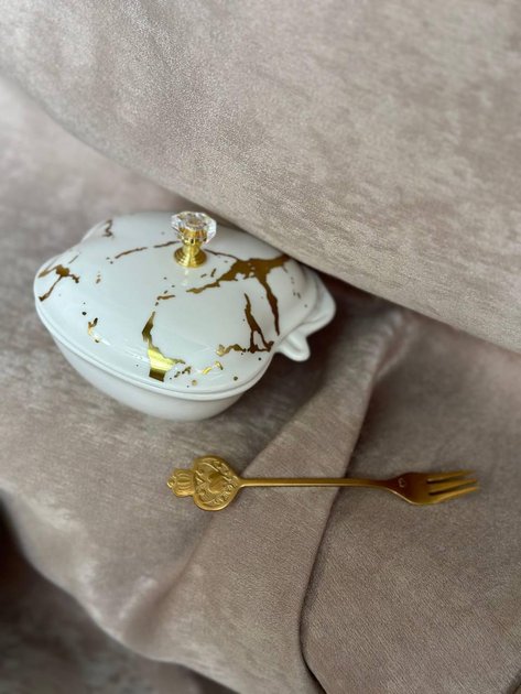Ёмкость для хранения 11 см 926-004 — это изящное изделие из фарфора, которое сочетает в себе практичность и стильный дизайн. Белая поверхность дополнена золотым мраморным узором, создающим роскошный акцент и делающим аксессуар гармоничным элементом любого интерьера. Крышка украшена удобной прозрачной ручкой с золотистой основой, что придаёт изделию дополнительную утончённость.