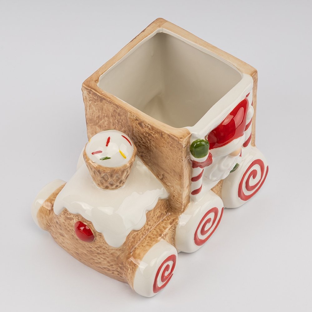 Ця керамічна ємність «Імбирний потяг» – справжнє святкове диво, яке оживить ваш дім. Кожна деталь виконана з любов’ю: білосніжна глазур з кольоровою присипкою нагадує цукрову помадку на пряниках, а веселий Санта у віконці вагона ніби запрошує вас у казкову подорож. Червонo-білі «карамельні» колеса та маленький ріжок створюють атмосферу новорічної радості й дитячих спогадів.