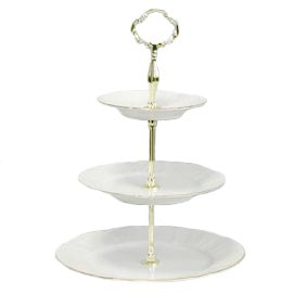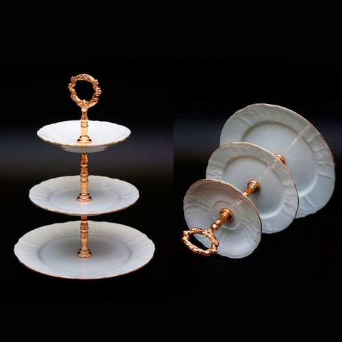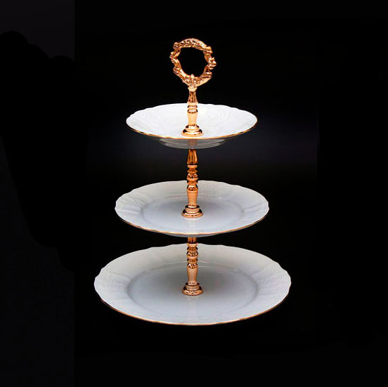 Центральна металева стійка кольору теплого золота з декоративним різьбленням і вишуканою ручкою не тільки прикрашає етажерку, а й забезпечує зручність при сервіруванні. Завдяки трьом ярусам, ви можете стильно подати десерти, закуски, фрукти або канапе, зекономивши простір на столі. Ця річ однаково доречна як на сімейному вечері, так і на святковому банкеті.