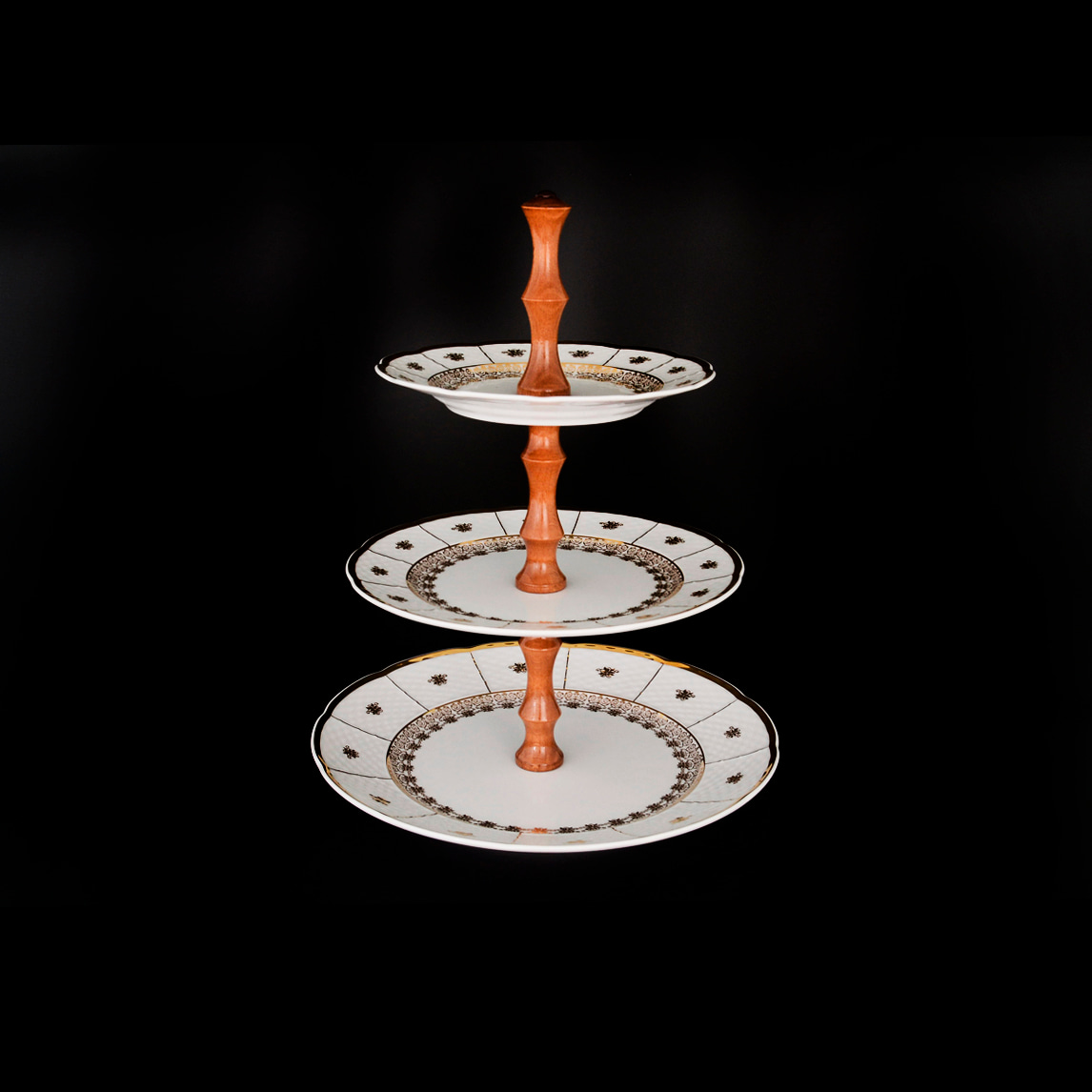 Этажерка 3-уровневая фарфоровая декорированная золотым орнаментом Thun Menuet с золотой каймой (15 см, 19 см, 25 см)