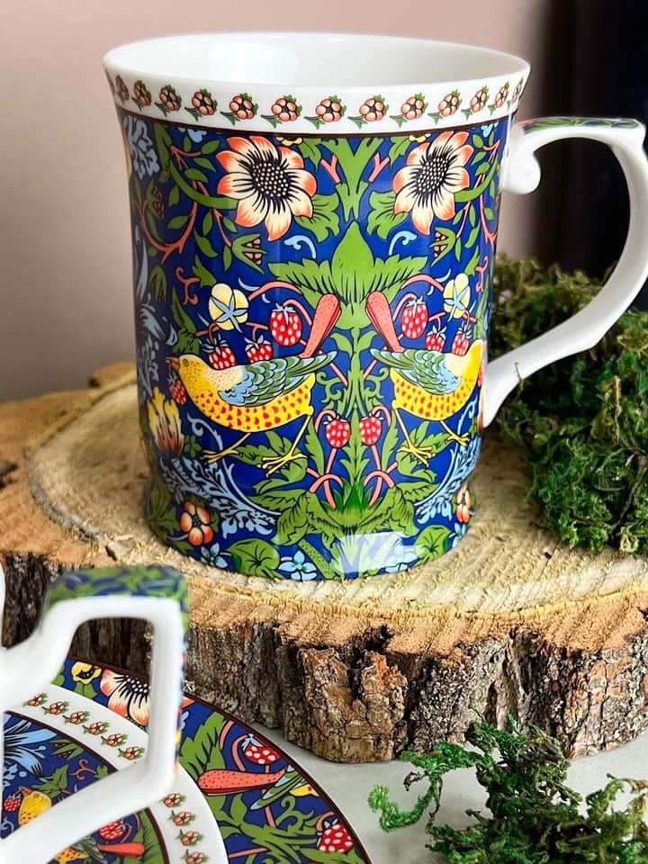 Фарфорова чашка Moppic об’ємом 400 мл — це справжній витвір декоративного мистецтва, натхненний класичним англійським дизайном Вільяма Морріса. Яскравий орнамент із квітами, птахами та ягодами створює відчуття радості й гармонії, перетворюючи кожне чаювання на естетичне задоволення. Насичений синій фон підкреслює яскравість кольорів і робить малюнок особливо виразним.