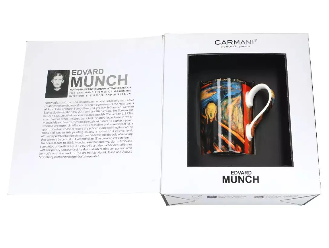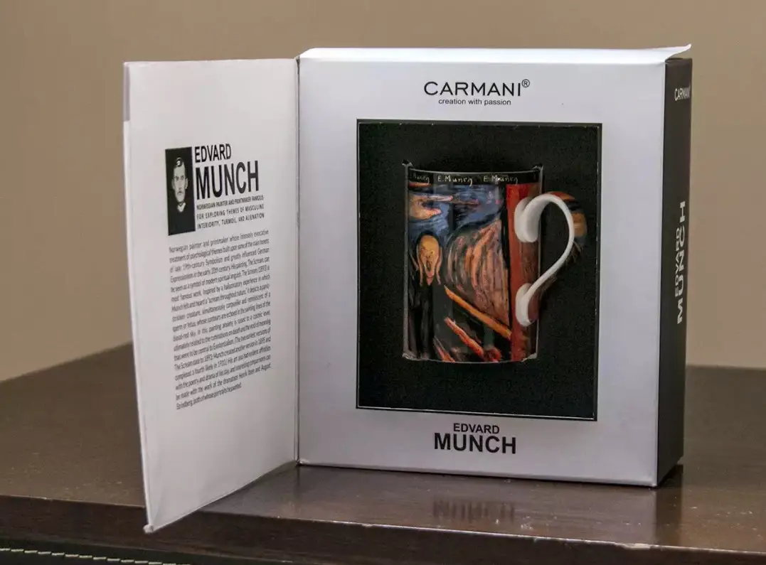 Фарфоровая чашка Carmani с репродукцией картины Эдварда Мунка «Крик» - это не просто посуда, а предмет с характером. Легендарное полотно, ставшее символом внутреннего напряжения и силы эмоций, получило новое прочтение в формате повседневной вещи. Чашка подчеркивает индивидуальность и привлекает внимание ярким и выразительным оформлением.