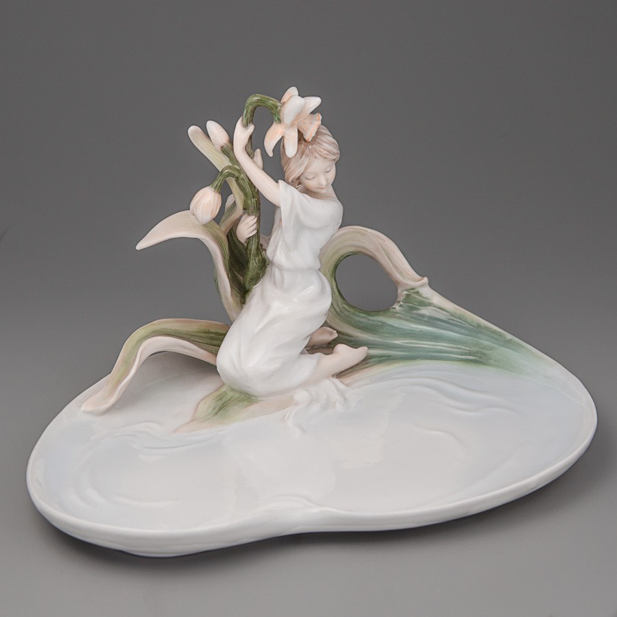 Это настоящее произведение искусства, в котором запечатлены мельчайшие детали хрупкой девушки, сидящей в окружении цветов нарциссов. Такое блюдо станет желанным подарком всем ценителям фарфоровых изделий и займет достойное место в коллекции и украсит интерьер, подойдет на подарок девушке, подруге, бабушке, коллеге, свекрови. Такой подарок точно произведет особый эффект и не оставит равнодушным человека, который получит его. Тем более, что статуэтка запакована в пенопласт и имеет красивую подарочную упаковку.
